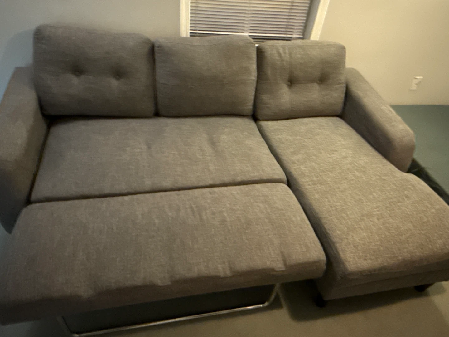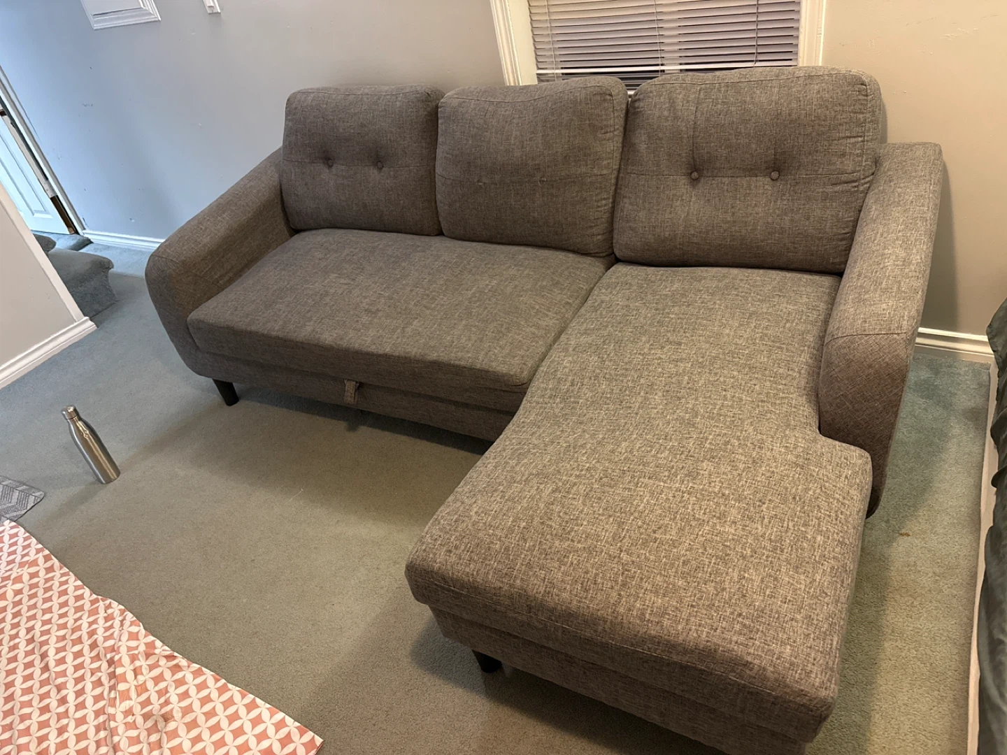 Selling a comfy grey sectional sofa with a chaise lounge! It's in great condition and perfect for relaxing after a long day. The chaise can be moved to either side. It's a great addition to any living room.