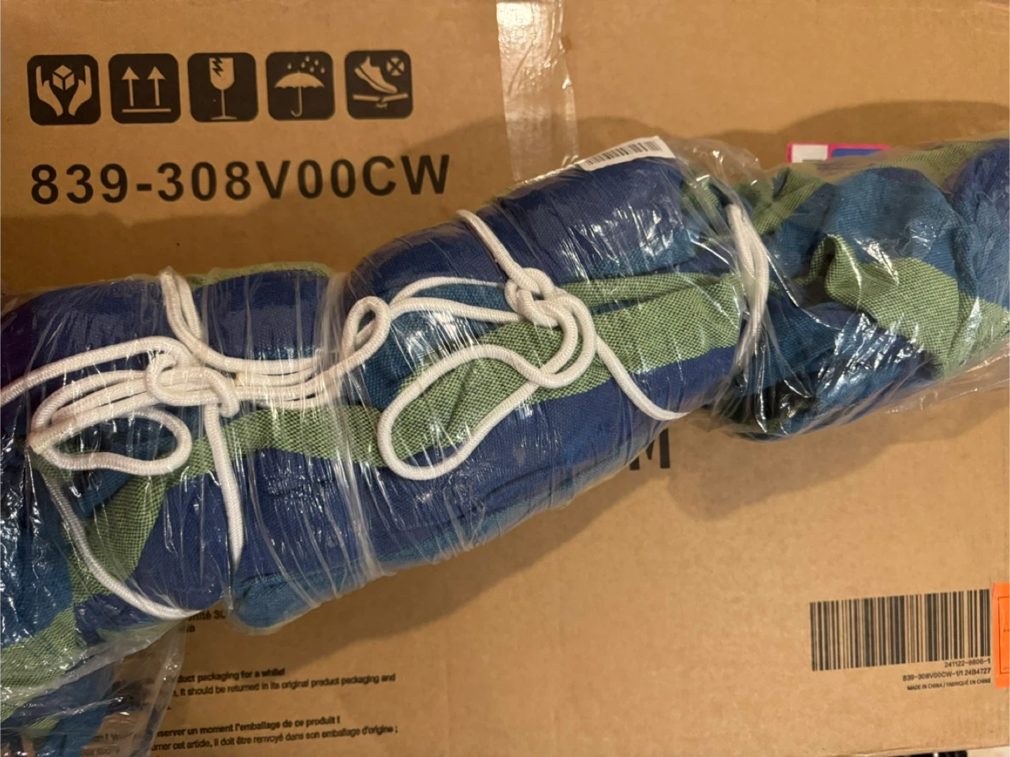Relax in style with this hammock! The hammock features a vibrant blue, green, and white striped pattern. It's in great condition and ready for your backyard or patio.