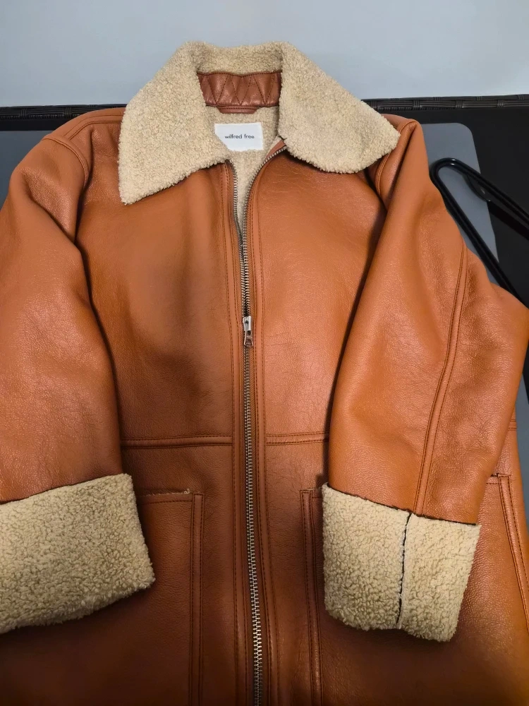 Selling a Wilfred Free vegan leather jacket! It's in great condition and features a cozy sherpa collar and cuffs. Perfect for adding a touch of vintage style to your wardrobe!