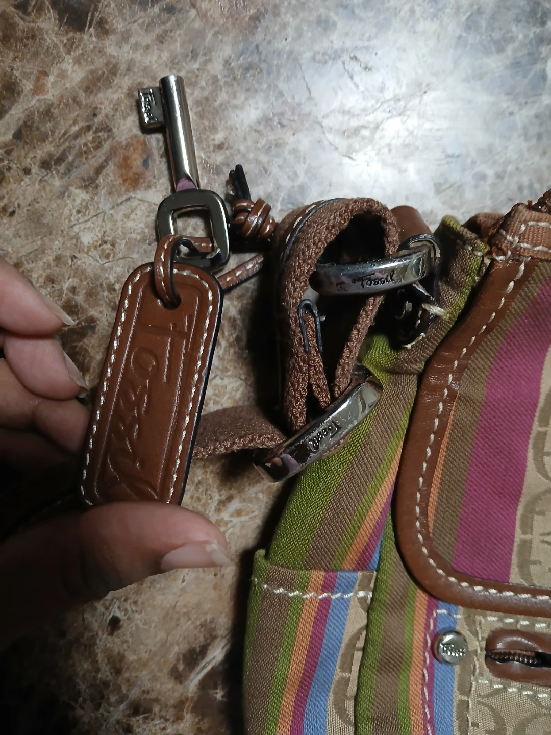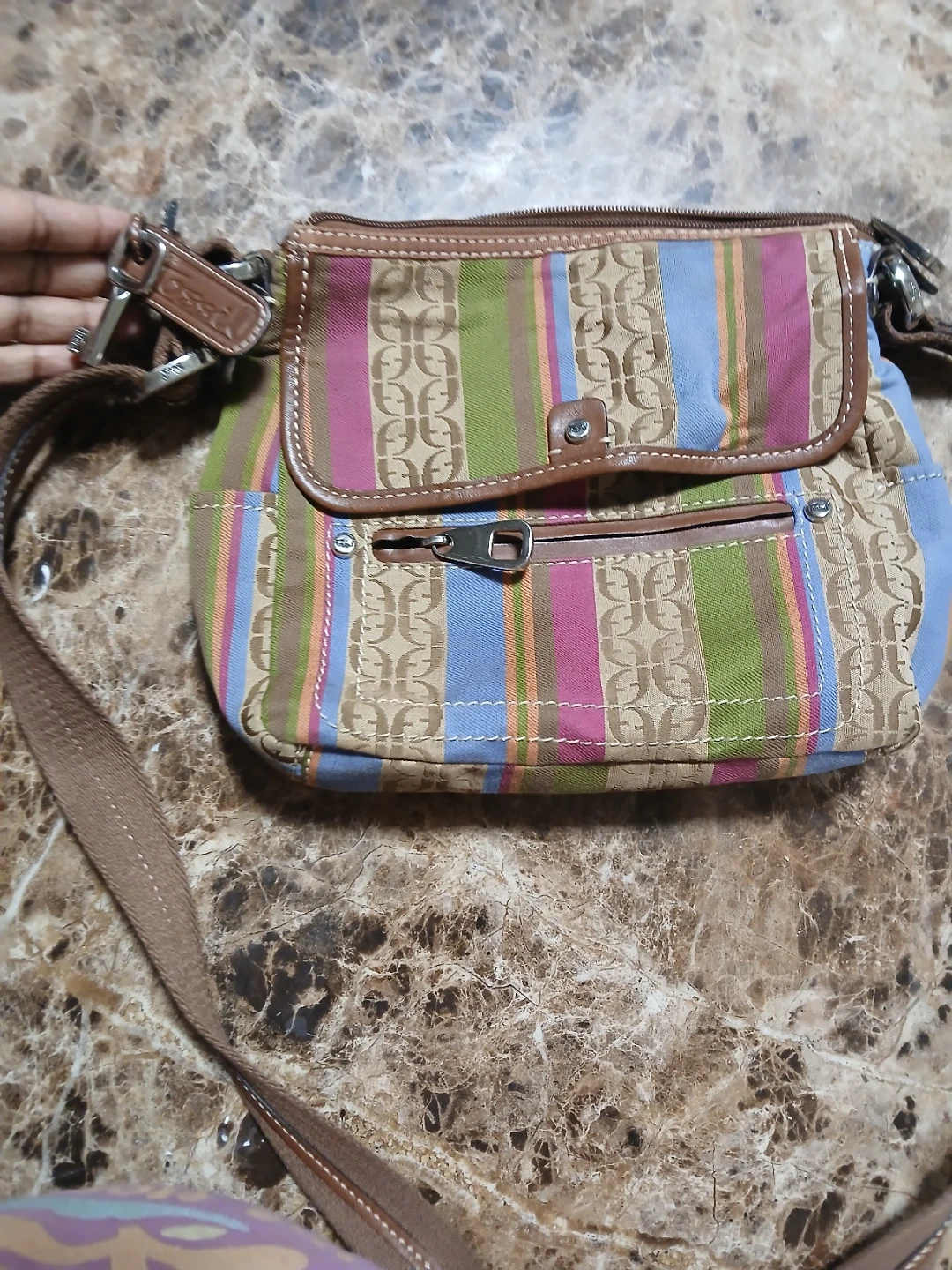 Check out this cute Fossil crossbody bag! It features a stylish striped design with a brown leather trim. The bag has a convenient zippered front pocket and a spacious interior. Price is firm plz. Pick up midland and Danforth or 401 bay street or stc mall