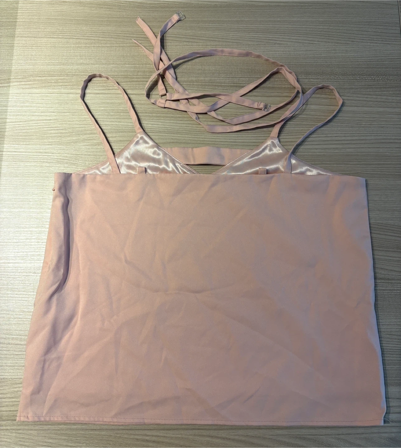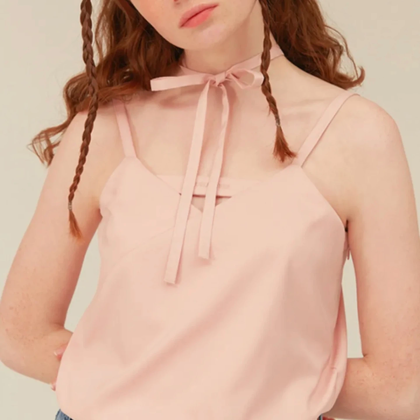 This is a cute pink cami top from OIOI COLLECTION. It features a unique design with straps that can be tied in different ways. Perfect for a casual summer look!