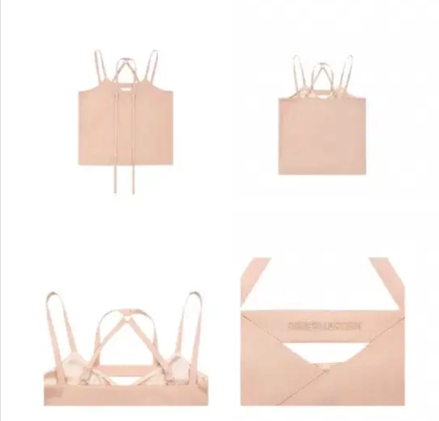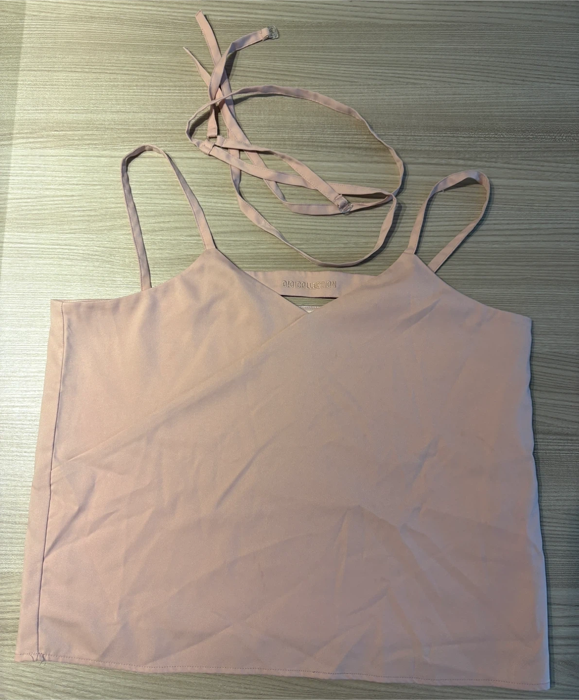 This is a cute pink cami top from OIOI COLLECTION. It features a unique design with straps that can be tied in different ways. Perfect for a casual summer look!