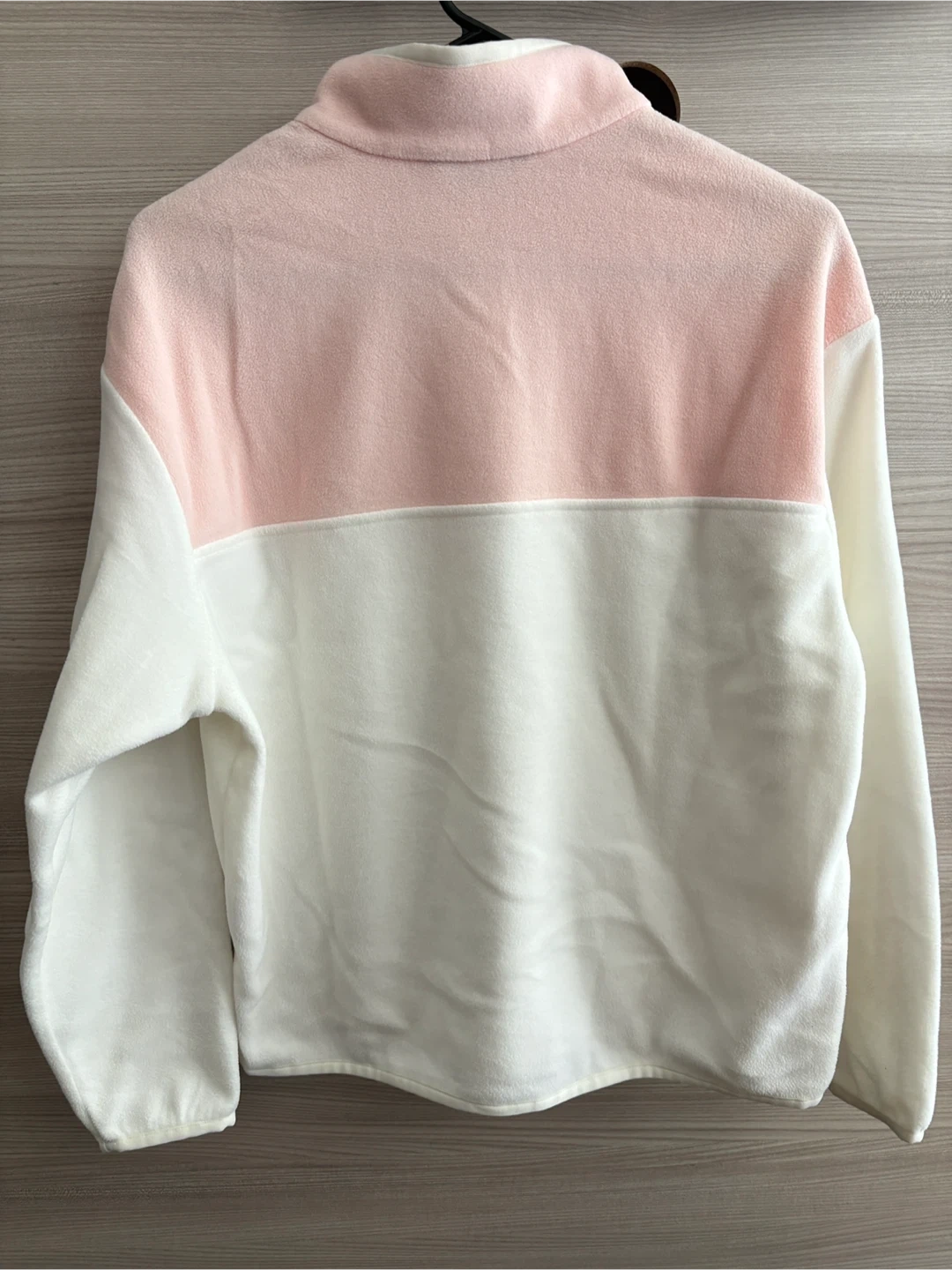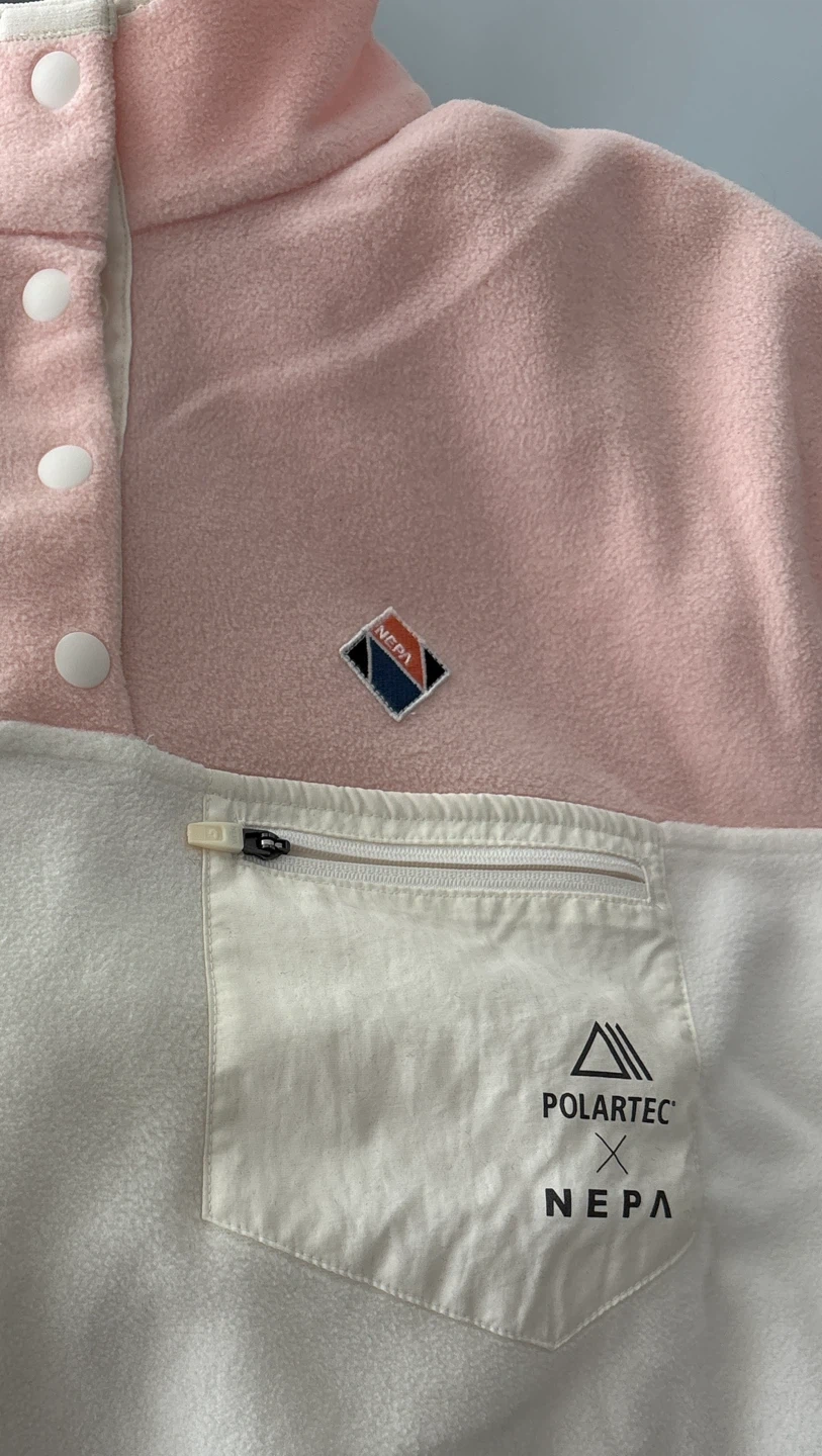 Cozy NEPA fleece pullover in a cute pink and white colour block design! Features a Polartec chest pocket with a zipper. Great for layering or wearing on its own for a comfy, casual look