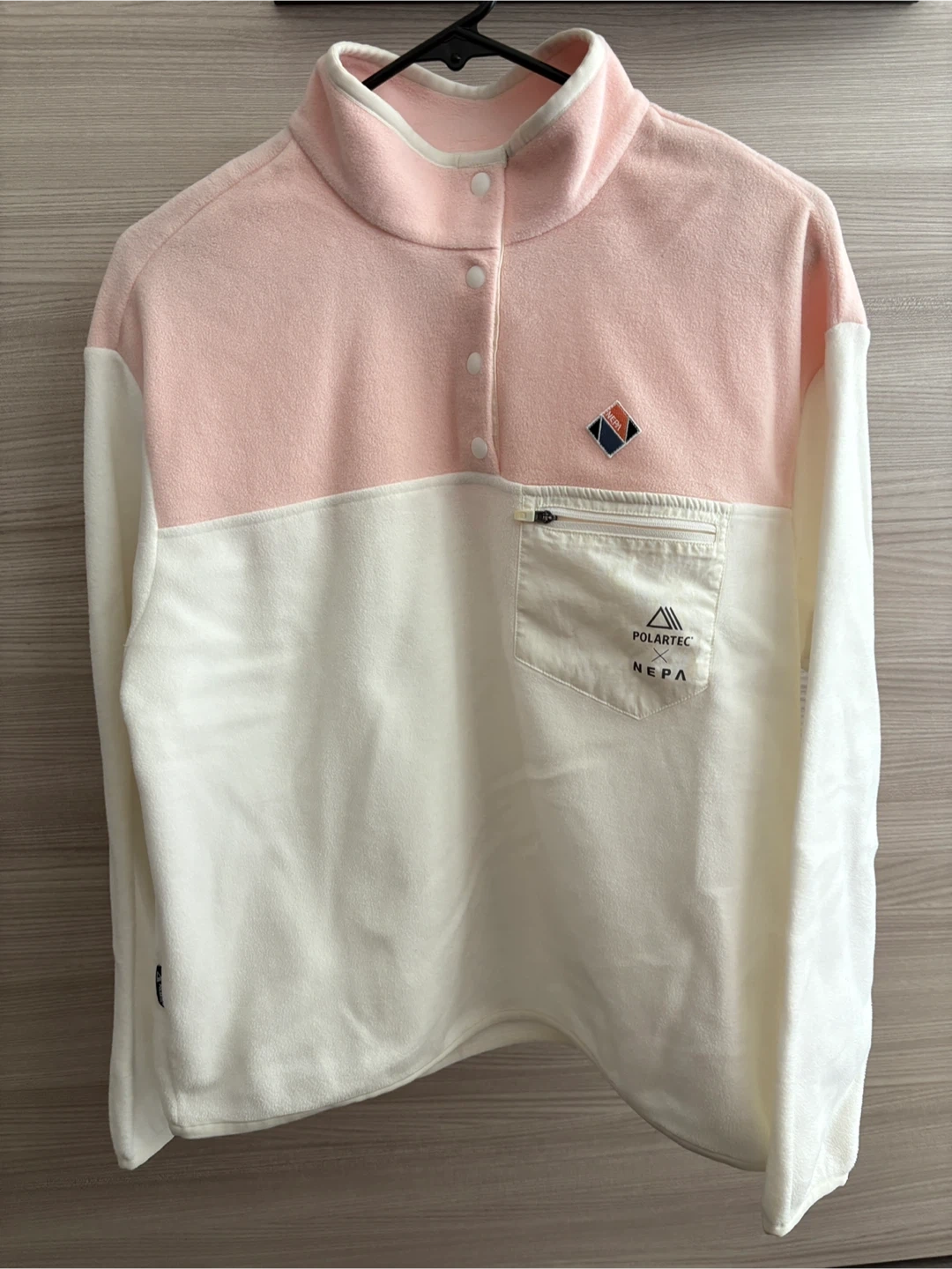 Cozy NEPA fleece pullover in a cute pink and white colour block design! Features a Polartec chest pocket with a zipper. Great for layering or wearing on its own for a comfy, casual look