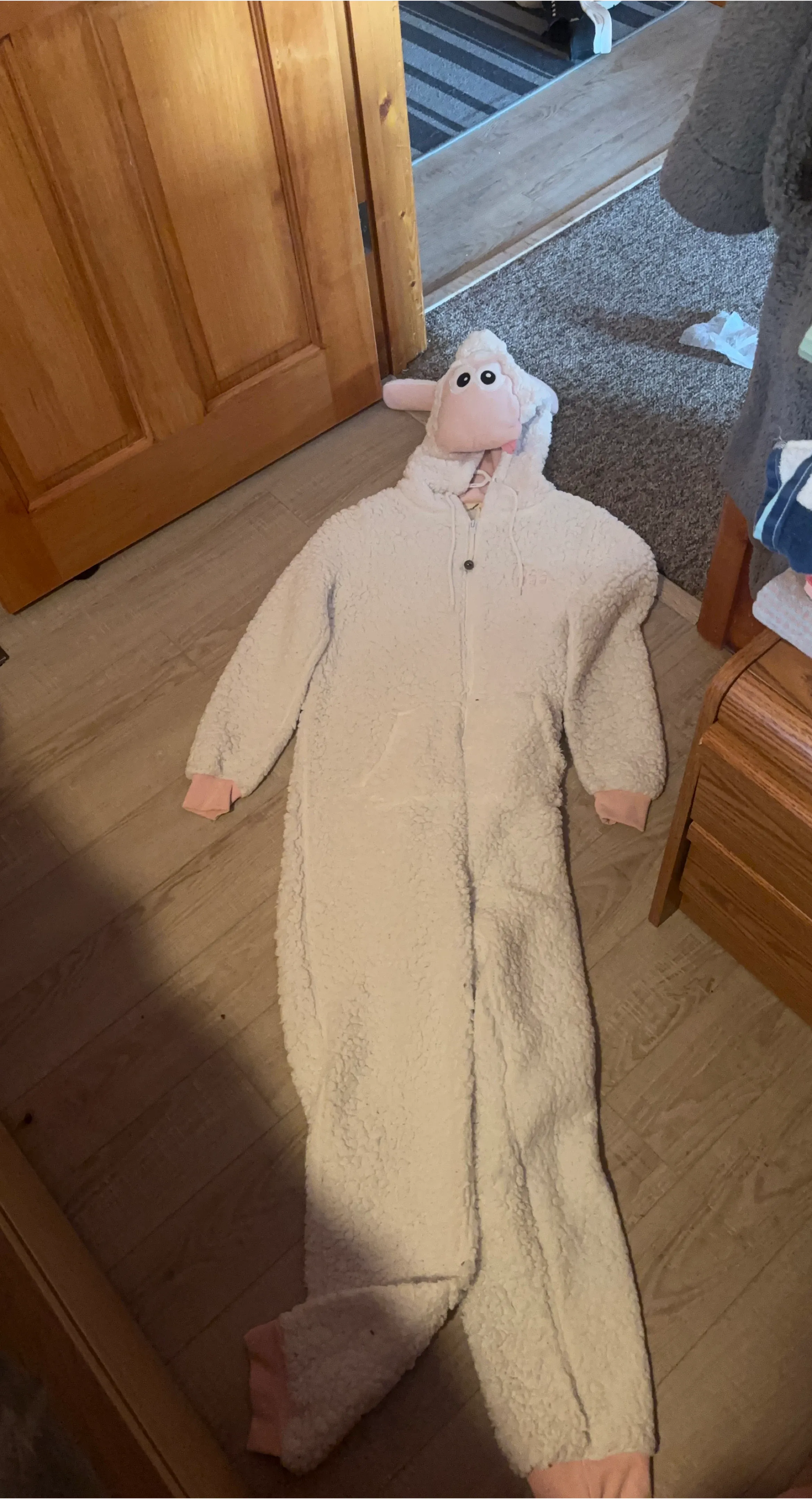 Super cute Sheep onesie for women! It's white with pink cuffs and a hood with sheep face on it. Perfect for dress-up or cozy nights in!