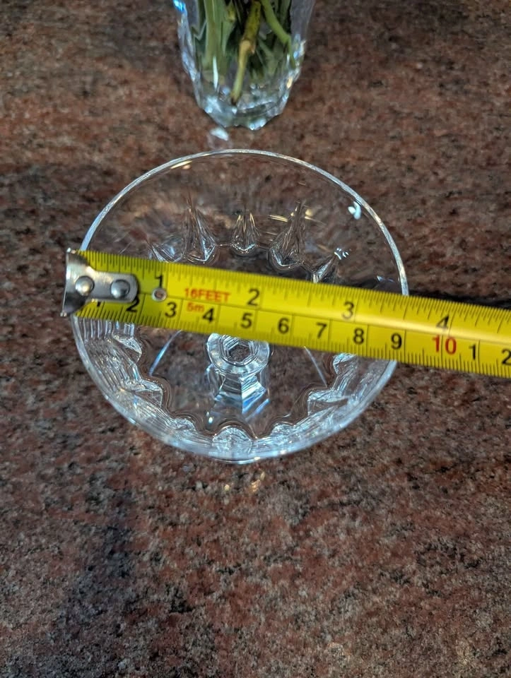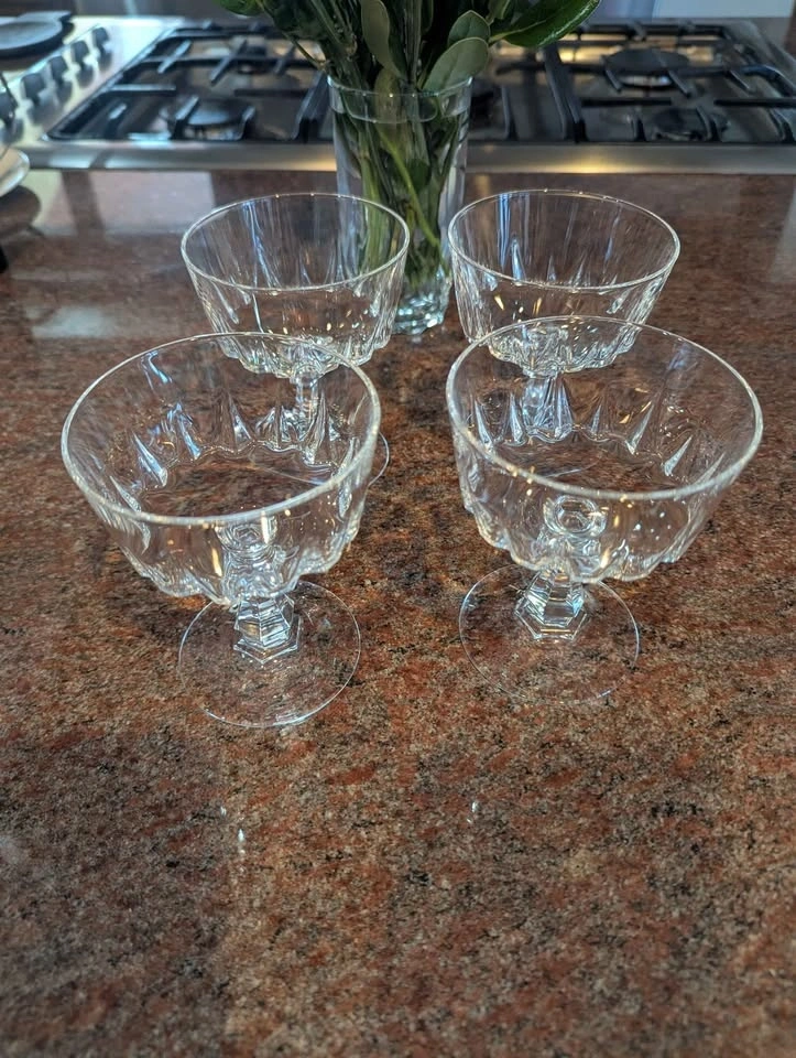 Set of 4 Cristal D'Arques-Durand Louvre pattern champagne or sherbet glasses. They feature a diamond cut pattern on the bowl and a geometric cut stem and base. Made of tempered glass, they are 3 to 5 times stronger than conventional glass. Each glass has a capacity of approximately 6 ounces (177 ml) and is versatile for champagne, sherbet, or cocktails. Cash only. Pick-up at McDonald’s parking lot, 65th St & Western Ave.