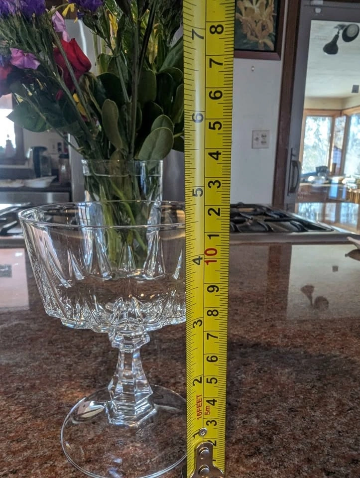 Set of 4 Cristal D'Arques-Durand Louvre pattern champagne or sherbet glasses. They feature a diamond cut pattern on the bowl and a geometric cut stem and base. Made of tempered glass, they are 3 to 5 times stronger than conventional glass. Each glass has a capacity of approximately 6 ounces (177 ml) and is versatile for champagne, sherbet, or cocktails. Cash only. Pick-up at McDonald’s parking lot, 65th St & Western Ave.