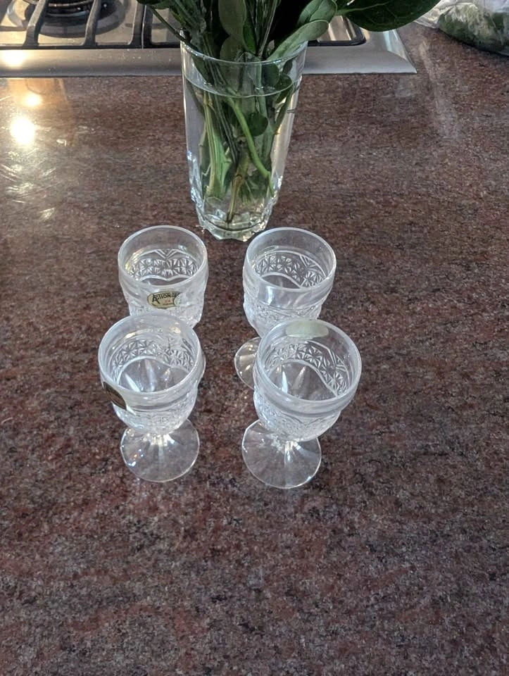 Set of 4 vintage Zajecar D’Adriana Luna hand cut crystal cordial glasses. These feature a diamond-cut pattern and were manufactured in 1988 in Yugoslavia. Perfect for serving cordials or shots. Cash only. Pick up at McDonalds on 65th St and Western Ave.