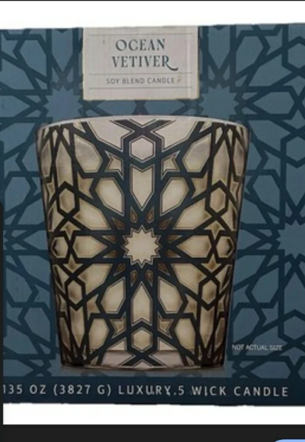 Selling a luxury Ocean Vetiver soy blend candle. It's a 135 oz, 5-wick candle. The design is really beautiful and would look great in any room!