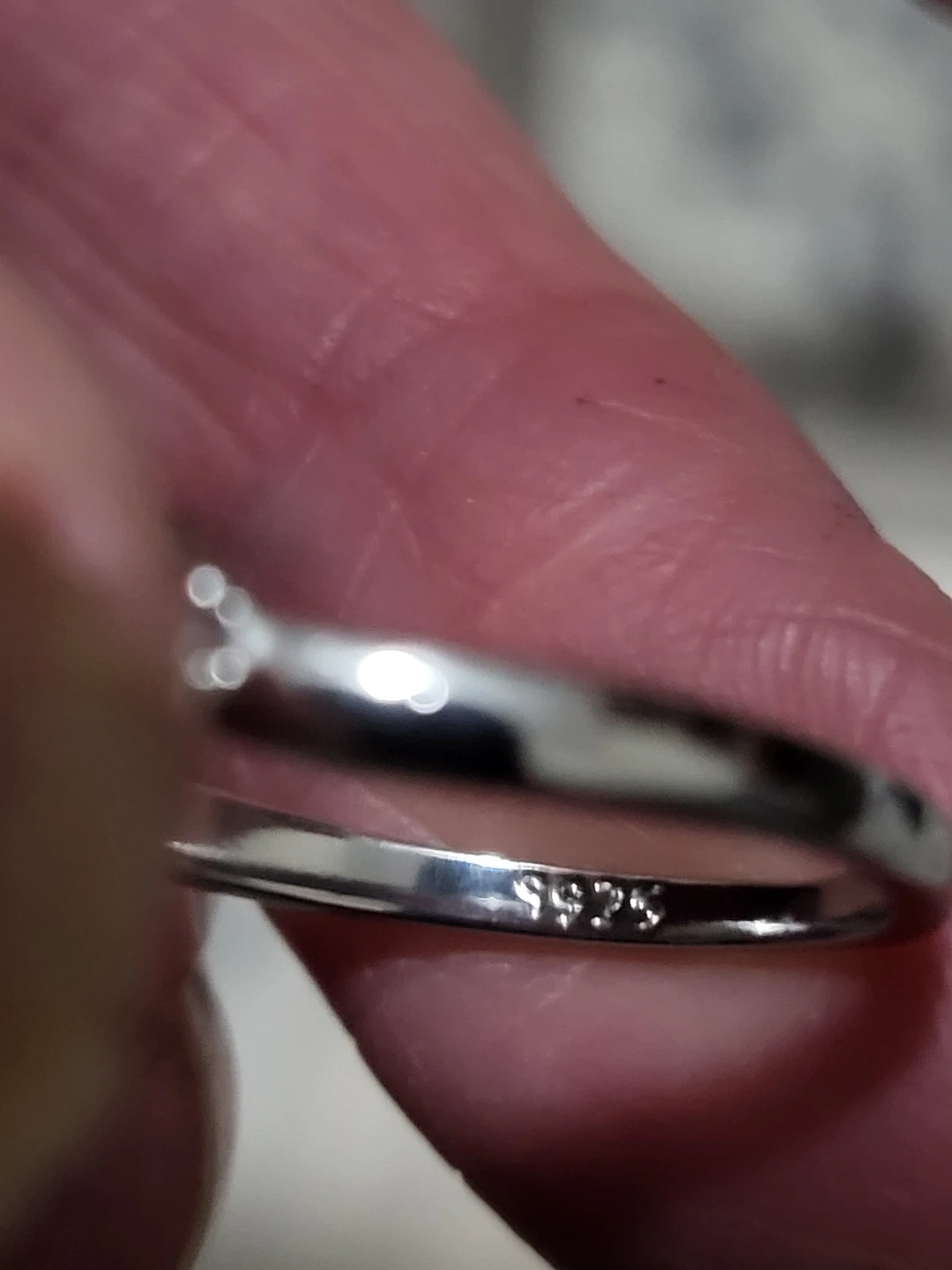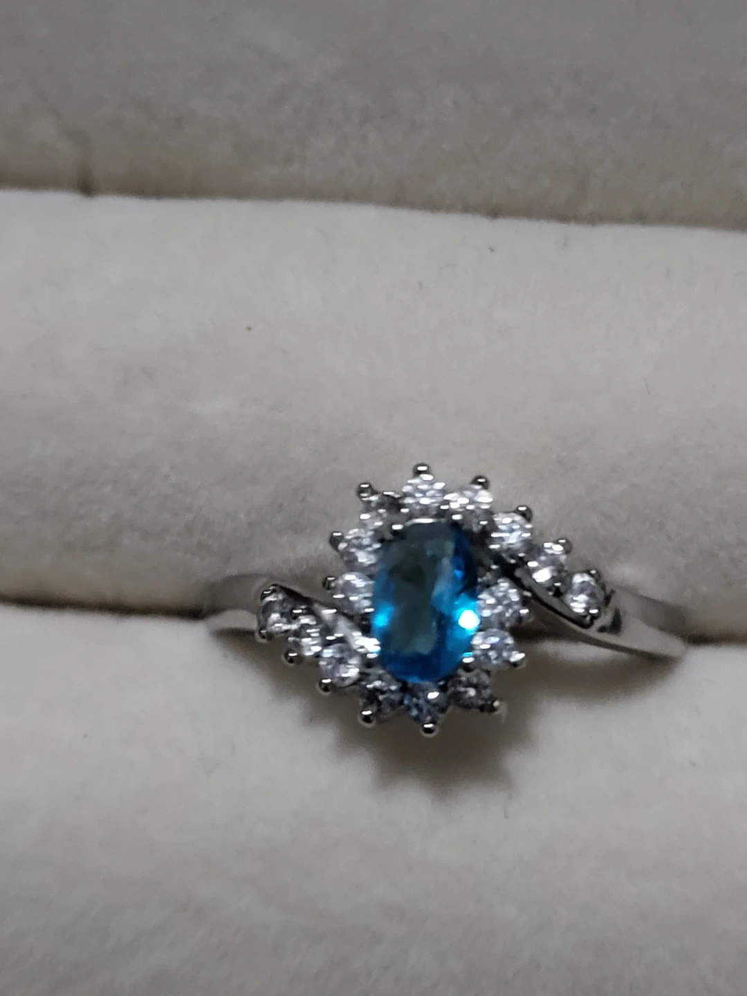 Selling a beautiful ring featuring a blue gemstone surrounded by smaller clear stones. The band is marked as sterling silver 925. It's approximately a size 6.5