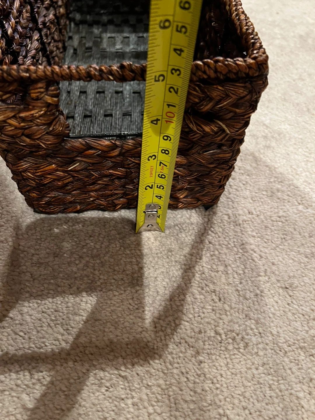 Selling a woven basket, perfect for storage or decor! It features a mix of brown and black weaves.