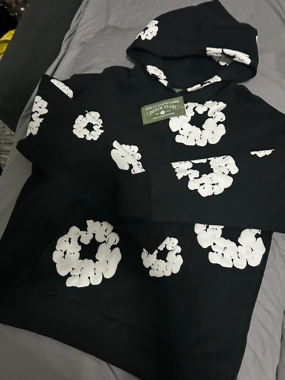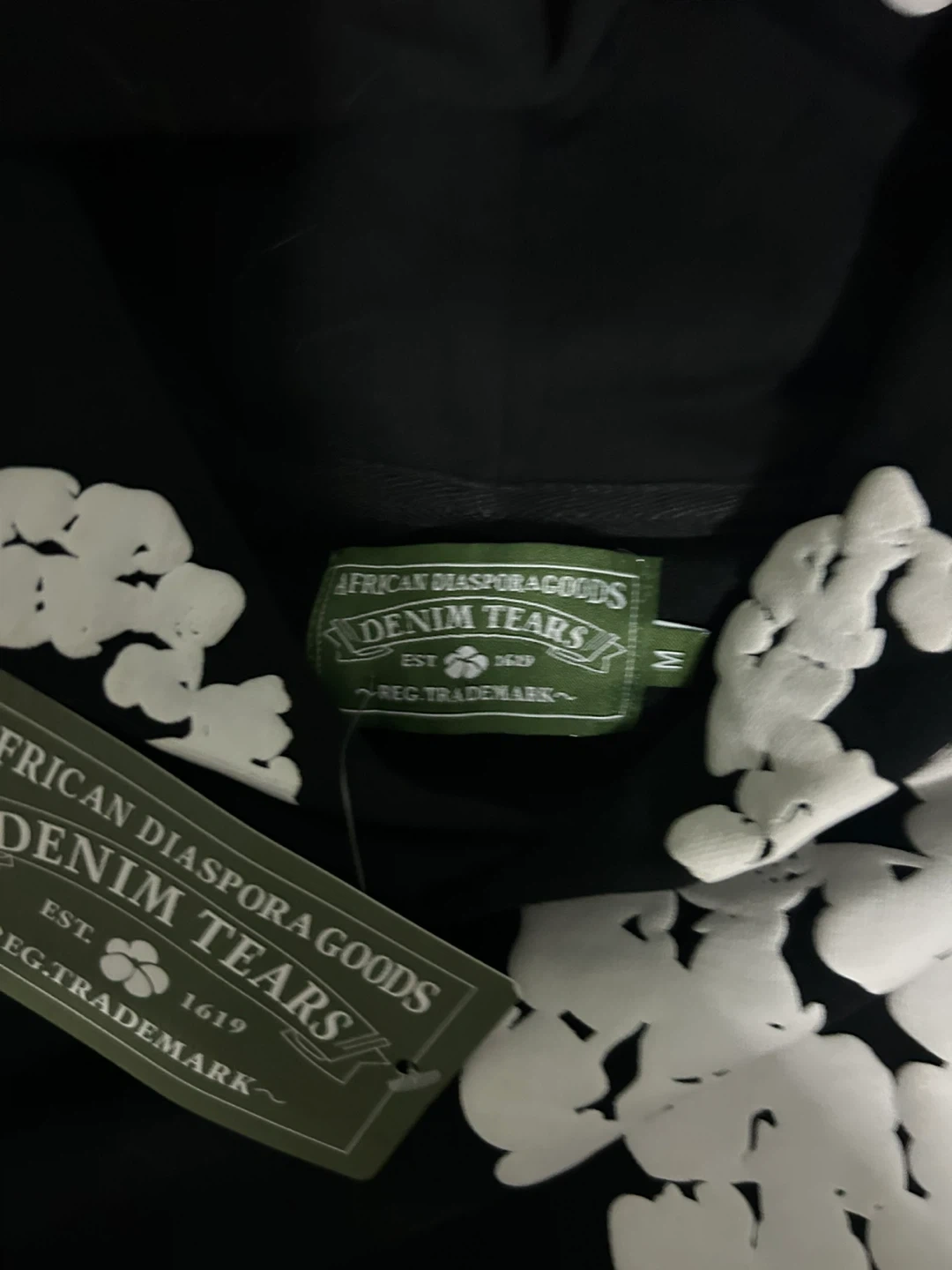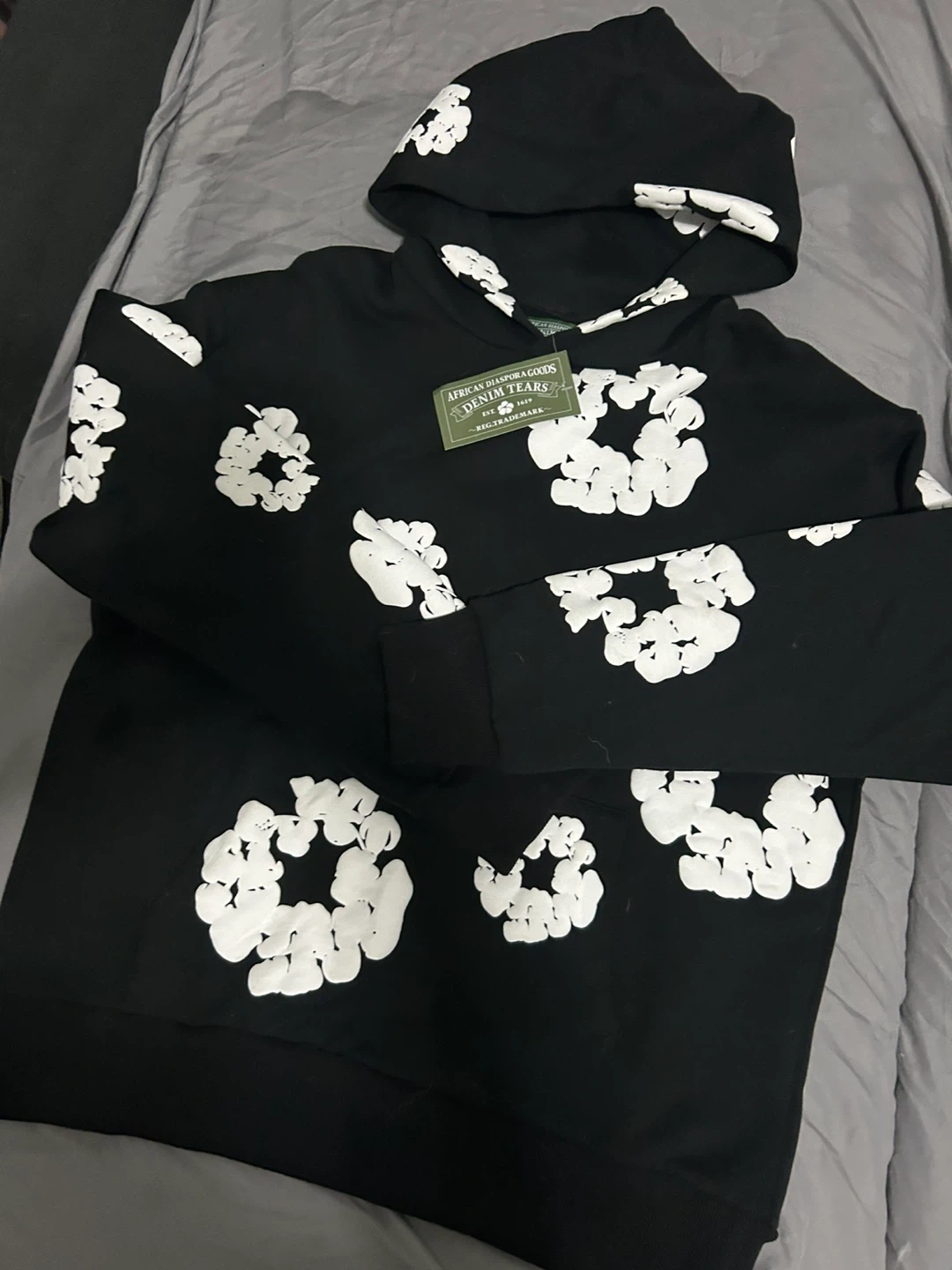 Selling a black hoodie from Denim Tears. It has a unique floral design. It's in great condition and ready for a new home