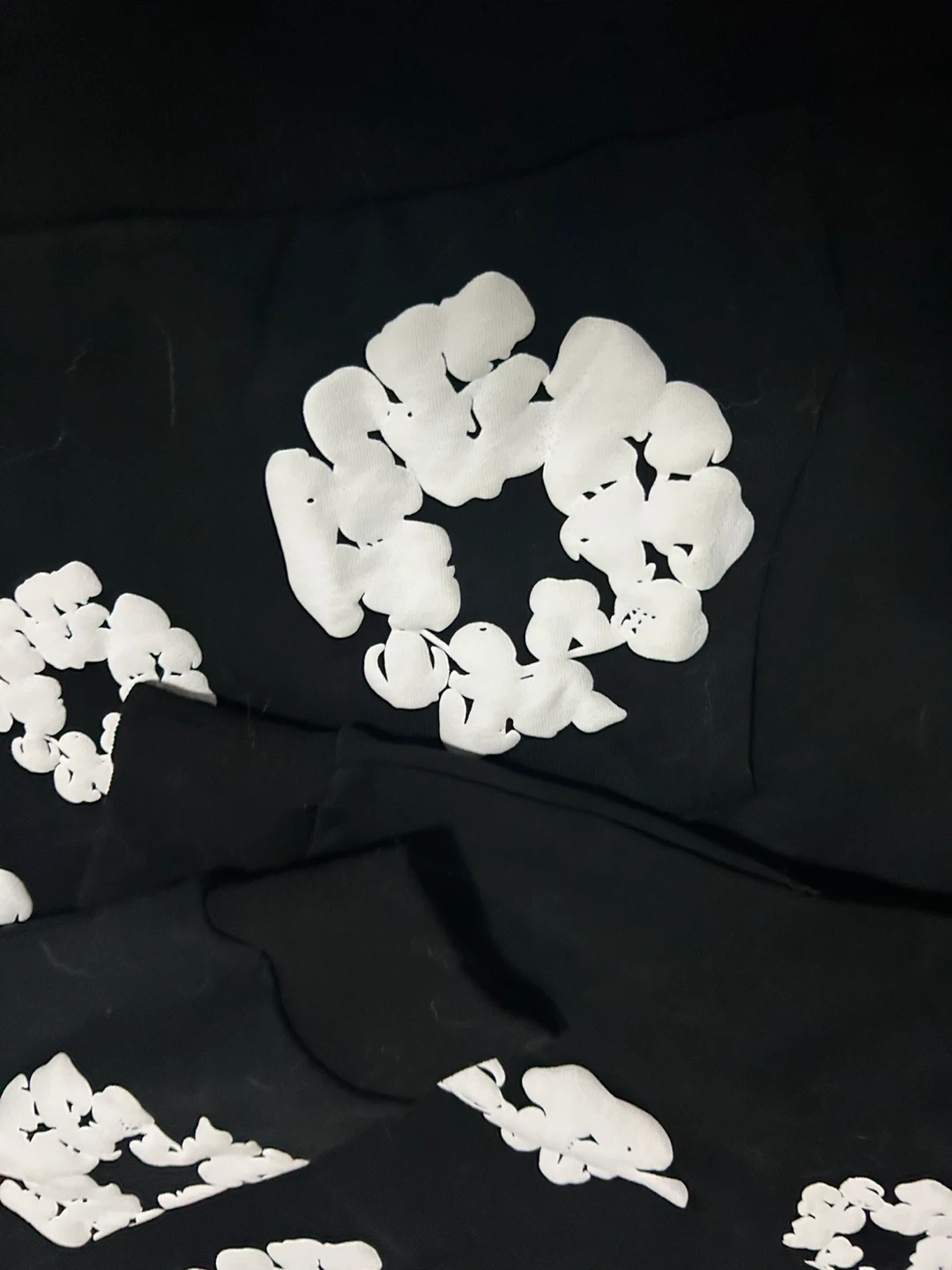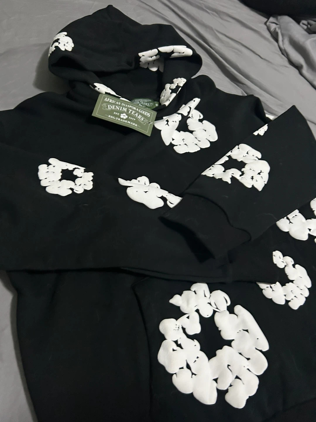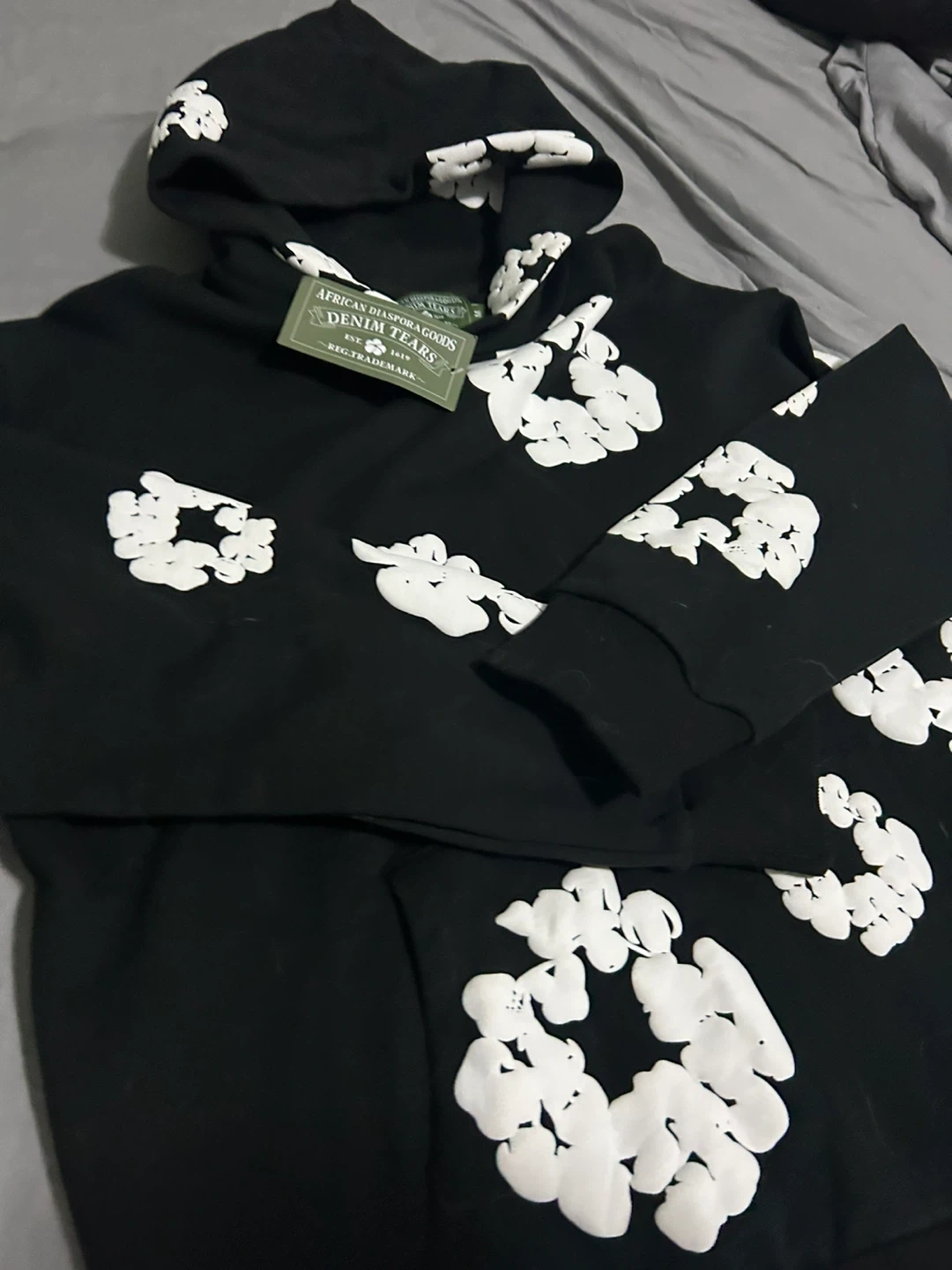Selling a black hoodie from Denim Tears. It has a unique floral design. It's in great condition and ready for a new home