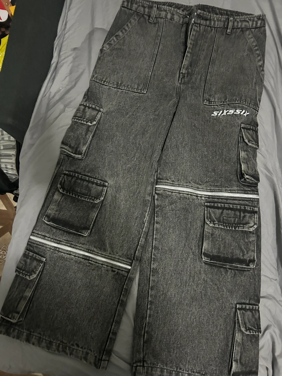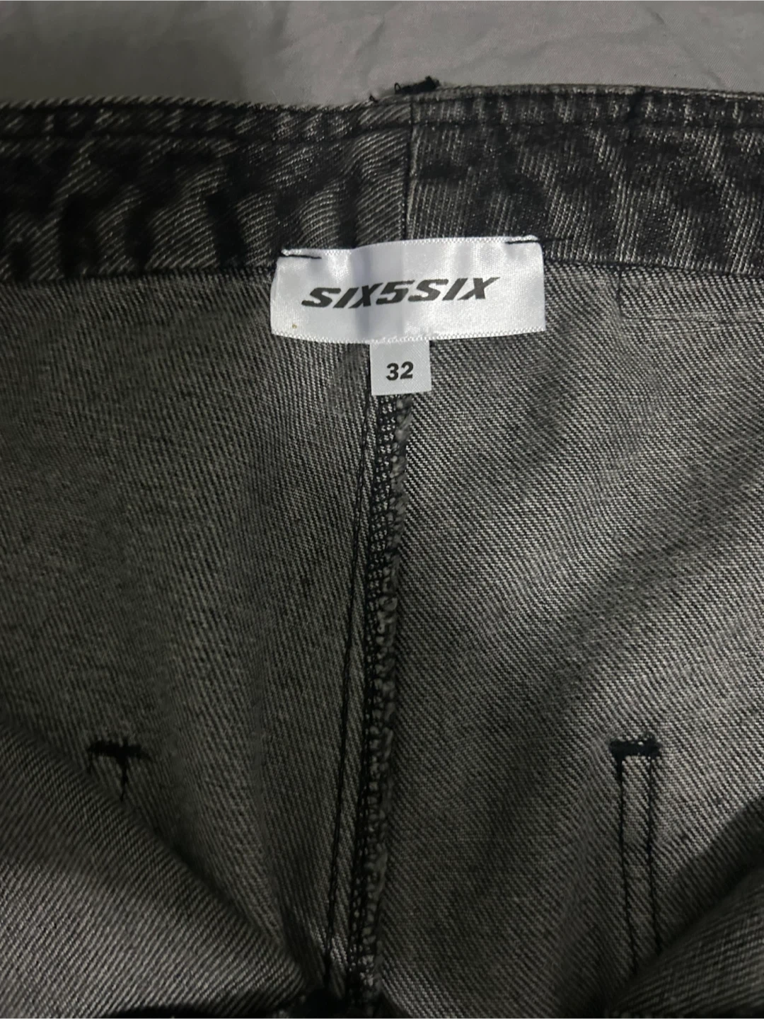 Selling a pair of SIX5SIX gray denim cargo pants. They are size 32 and have a cool, functional design with lots of pockets!