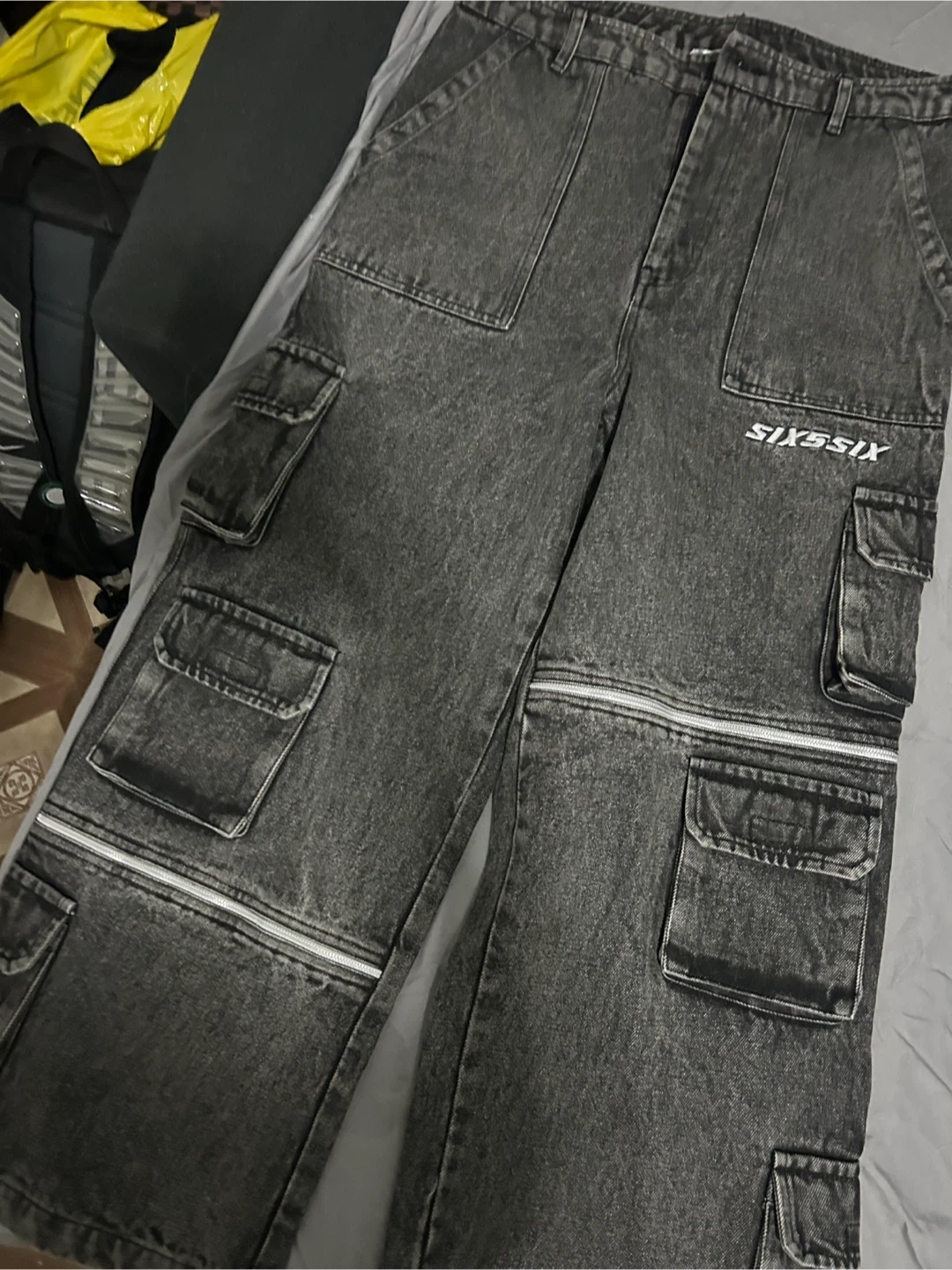 Selling a pair of SIX5SIX gray denim cargo pants. They are size 32 and have a cool, functional design with lots of pockets!