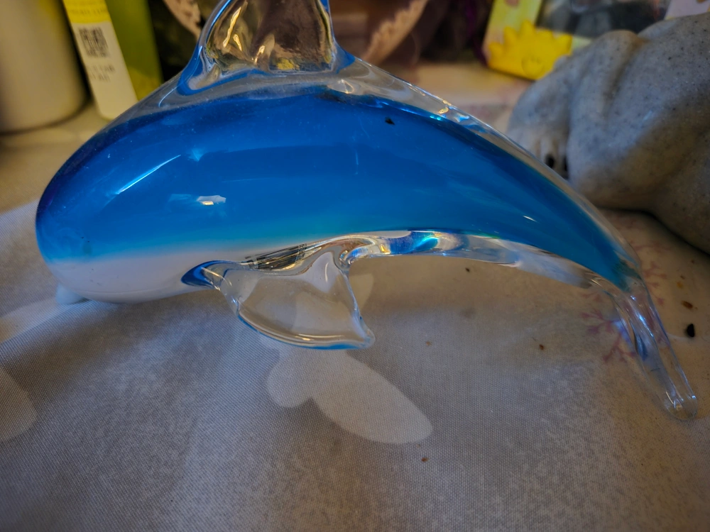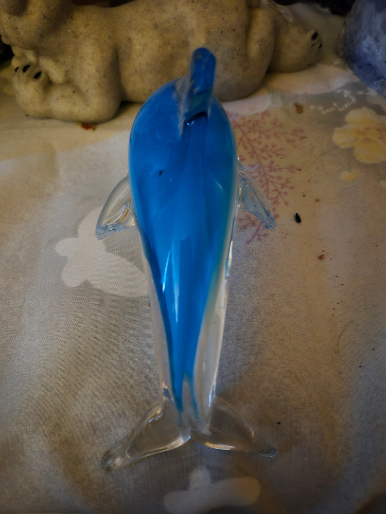 Here's a lovely blue and clear glass dolphin figurine! It's in great shape and would look great on a shelf or desk. A unique piece to add to your collection