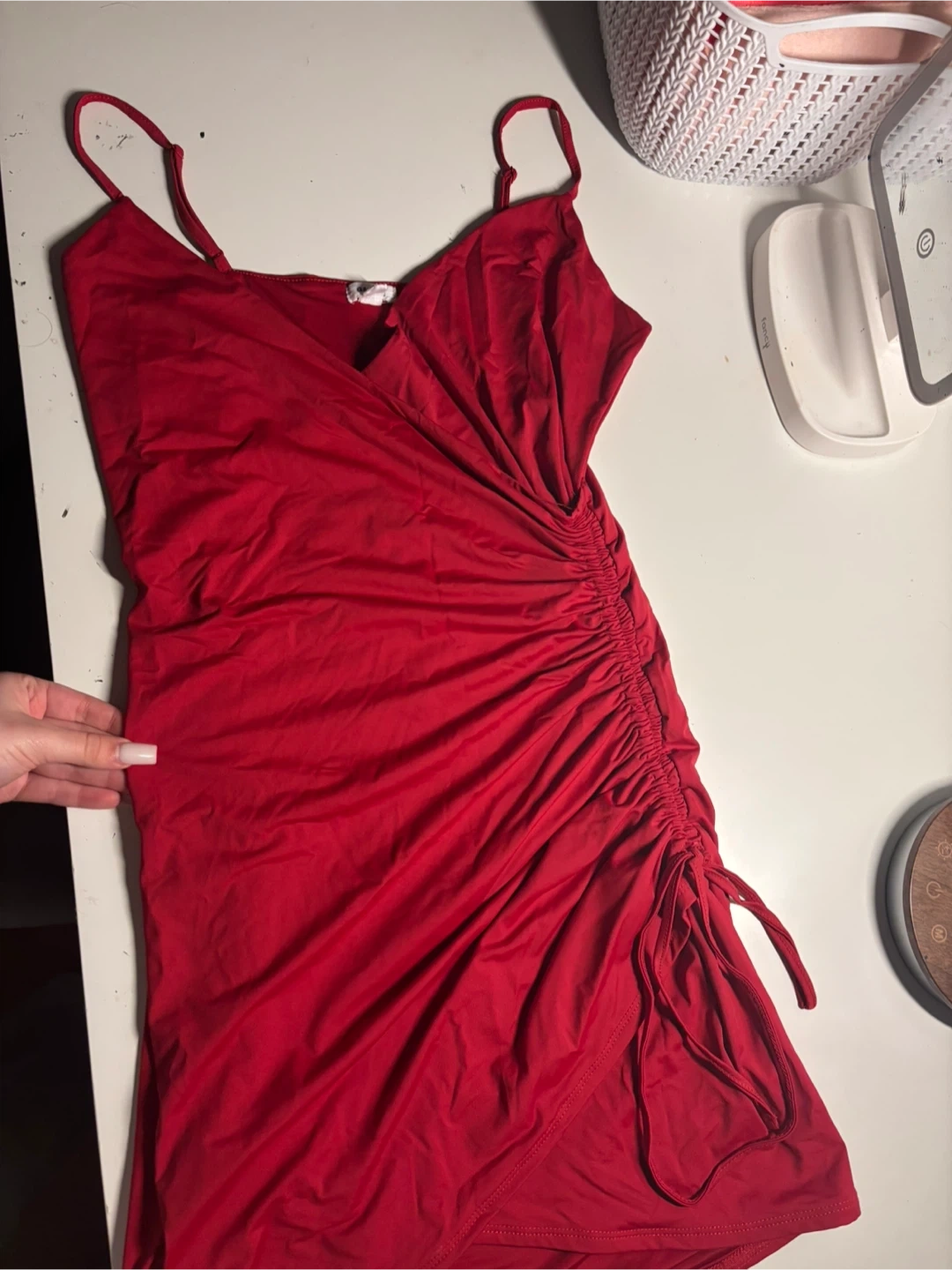 Cute red mini dress! It features a wrap style and a drawstring detail on the side. Perfect for a night out or a casual summer day