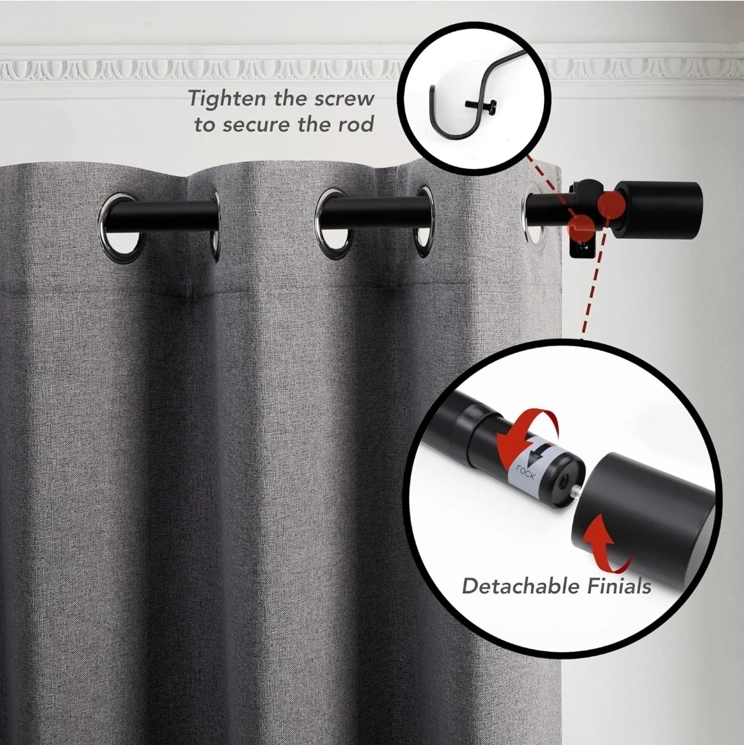 Selling a Deconovo black telescoping curtain rod, perfect for adding a touch of elegance to your living room! It can extend from 48 to 84 inches, so it's adjustable to fit different window sizes. The set includes the rod, finials, brackets, wall plugs, and screws, so you'll have everything you need for installation
