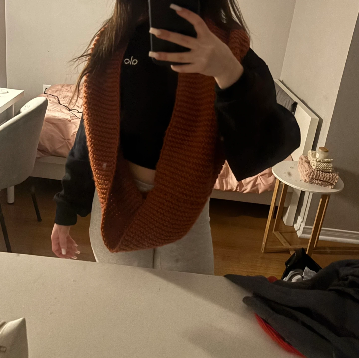 Cozy up with this hand-knitted infinity scarf! It's a lovely burnt orange colour and perfect for adding a pop of warmth to any outfit. The soft texture makes it super comfortable to wear, and its circular design means you can style it in so many ways. It's in great condition and ready for a new home!