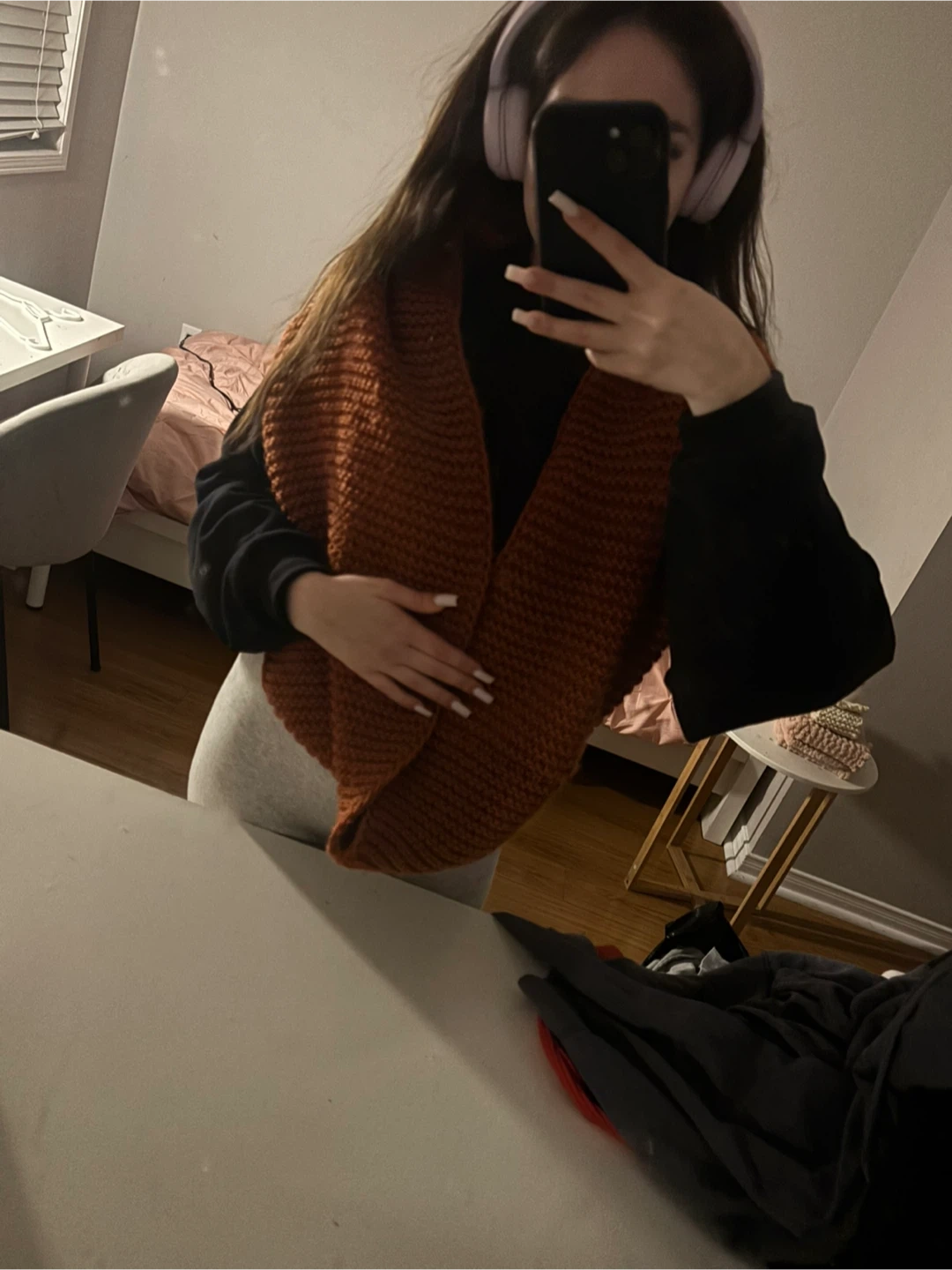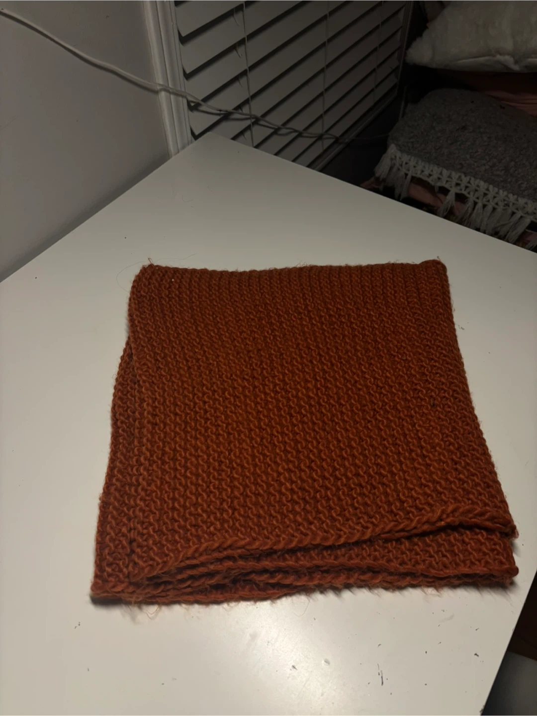 Cozy up with this hand-knitted infinity scarf! It's a lovely burnt orange colour and perfect for adding a pop of warmth to any outfit. The soft texture makes it super comfortable to wear, and its circular design means you can style it in so many ways. It's in great condition and ready for a new home!