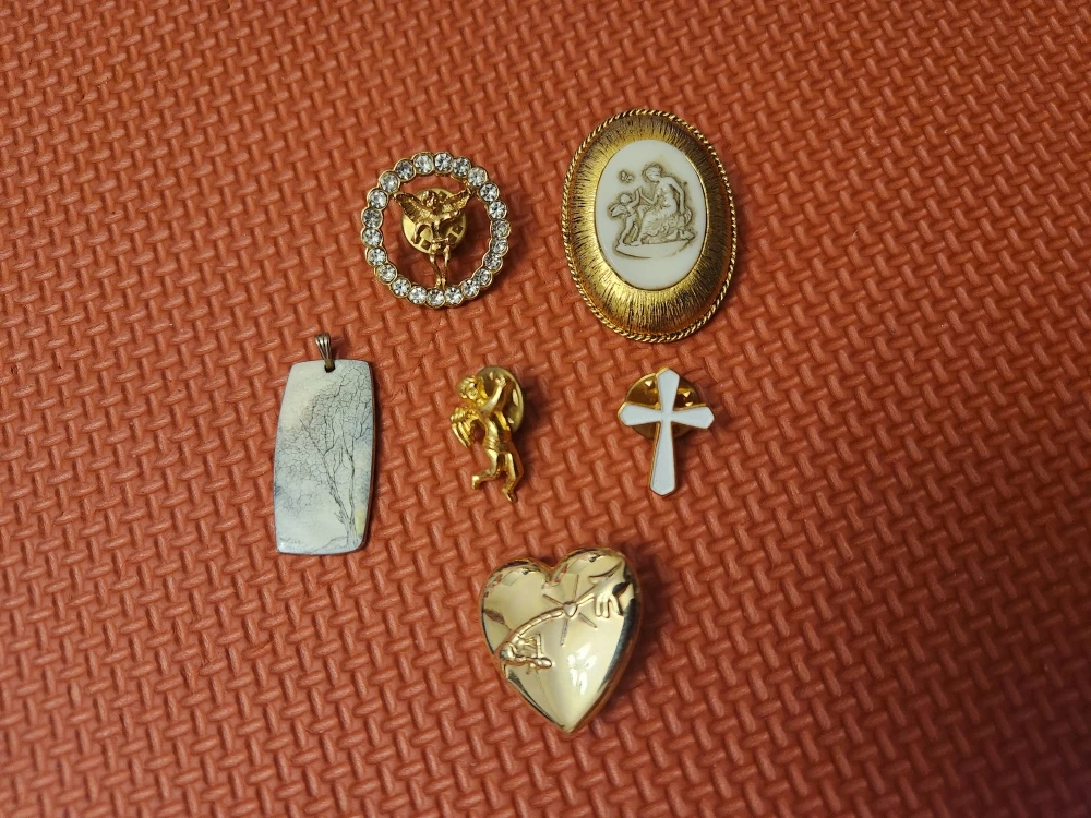 Selling a collection of vintage brooches and pendants! Includes a variety of styles, such as an angel brooch, a religious scene brooch, a tree pendant, an angel pin, a cross pin, and a heart pendant. Perfect for adding a touch of vintage charm to any outfit or collection