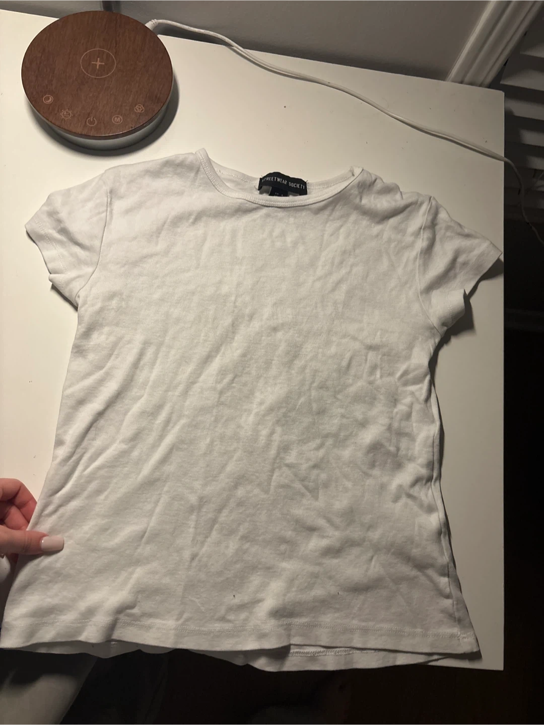 A simple and clean white t-shirt from Streetwear Society. It's a size XS and in okay condition. Perfect for everyday wear!
