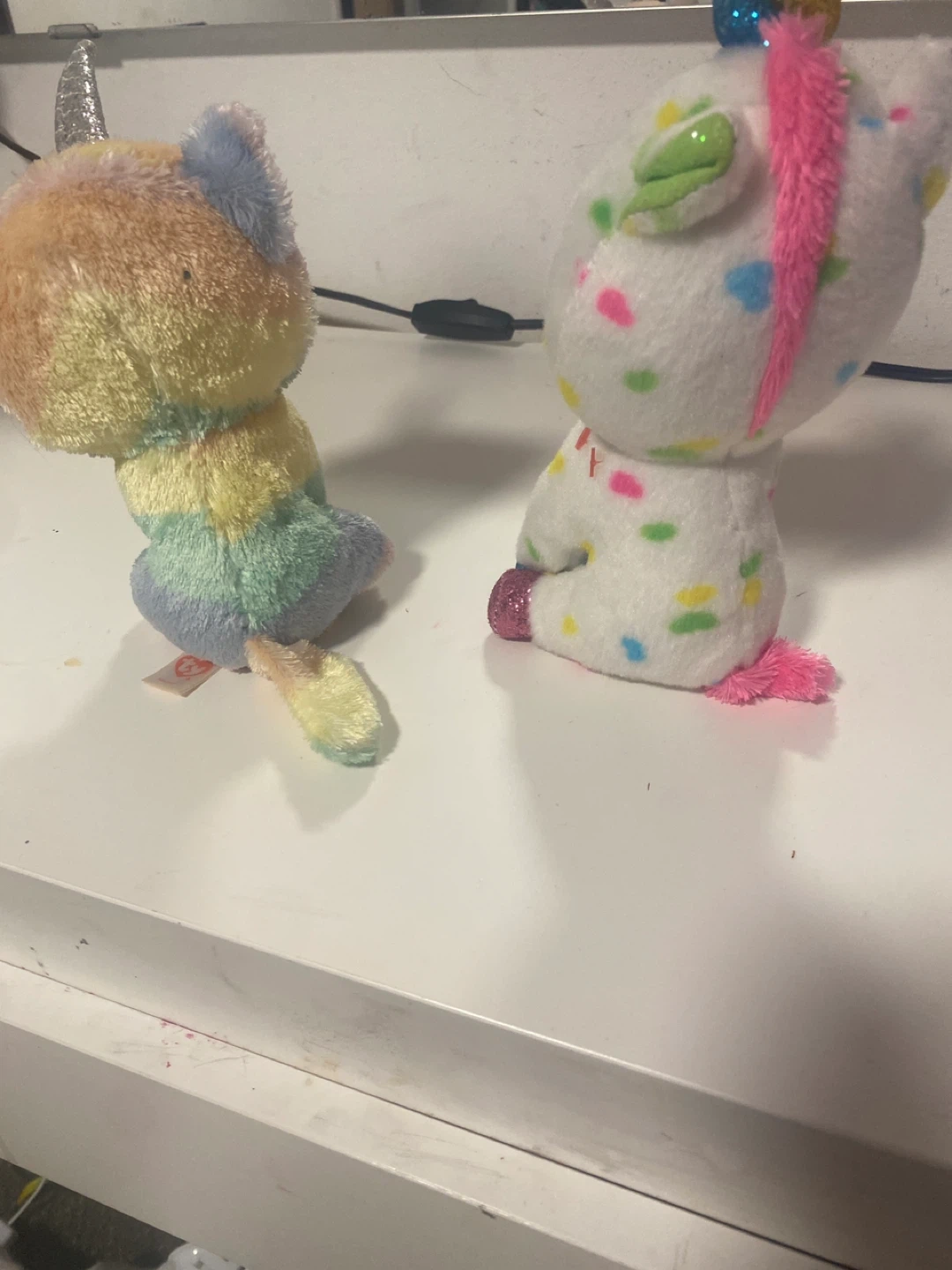 Selling two adorable Ty Beanie Boos! One is Heather, a pastel rainbow unicorn cat, and the other is Confetti, a white unicorn with colourful confetti spots and a pink tail. Both are in great condition and ready for a new home