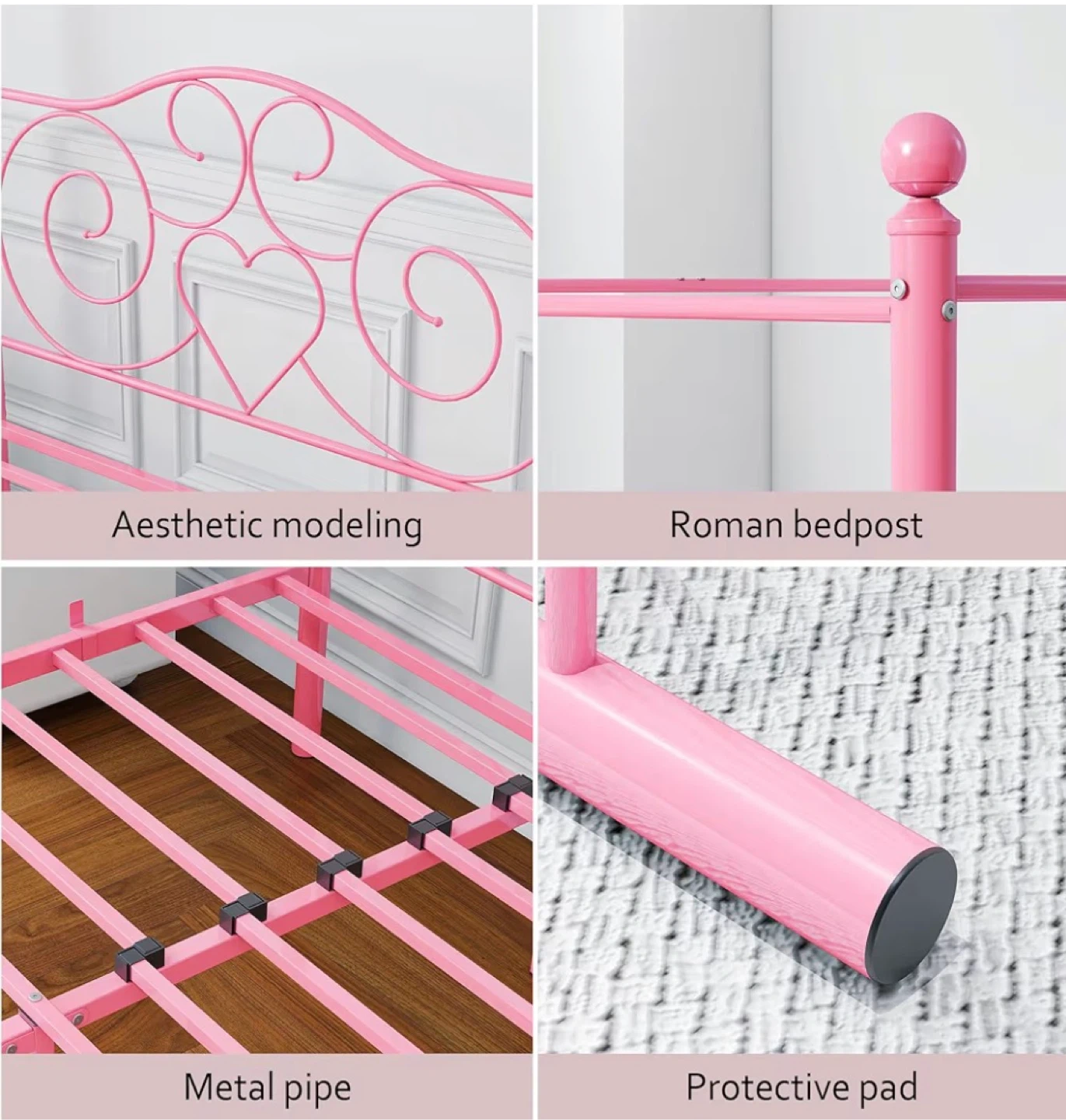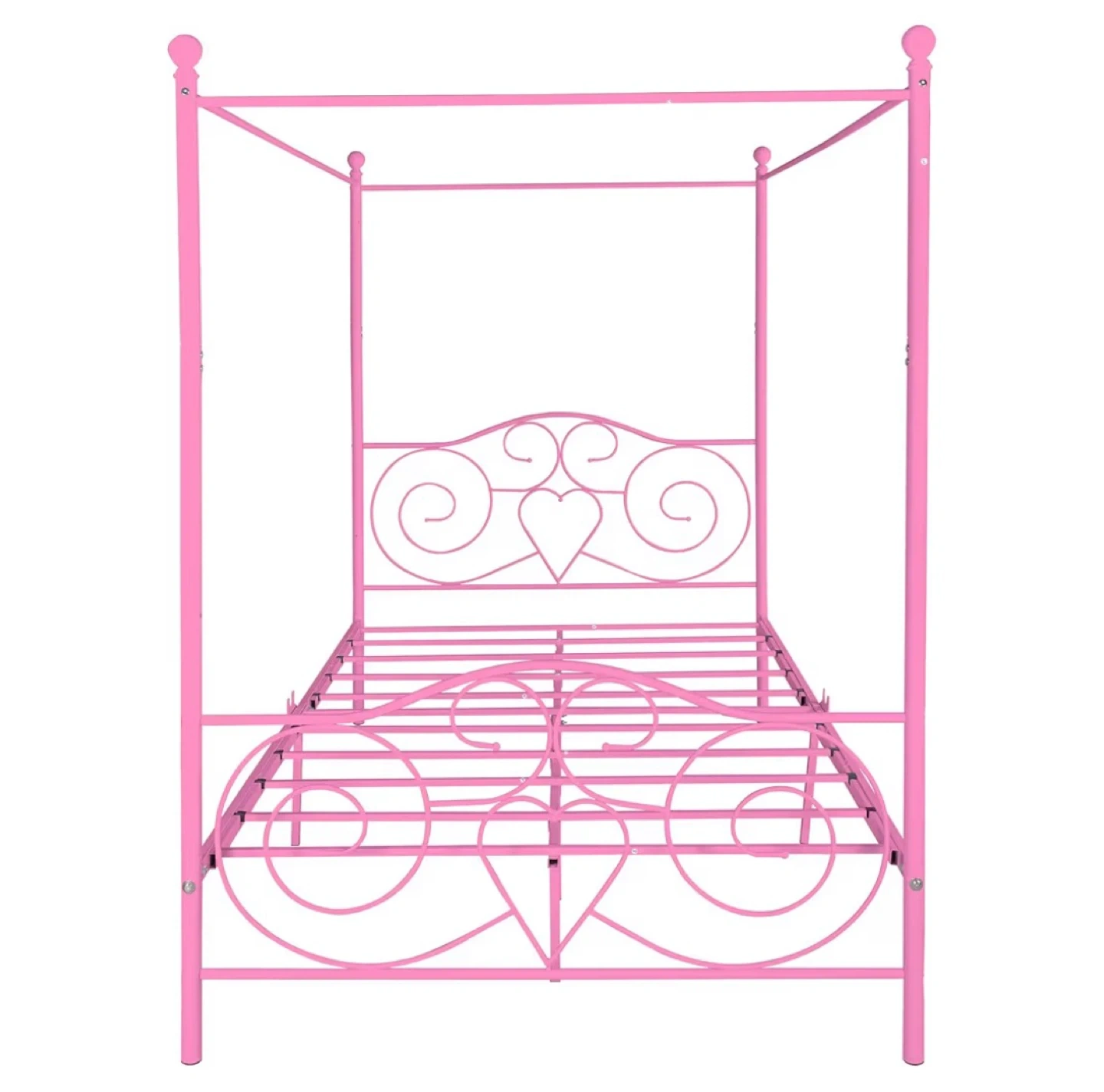 Here's a super cute pink metal canopy bed frame! It features aesthetic modelling with a heart design, Roman bedposts, metal pipes, and protective pads on the feet.