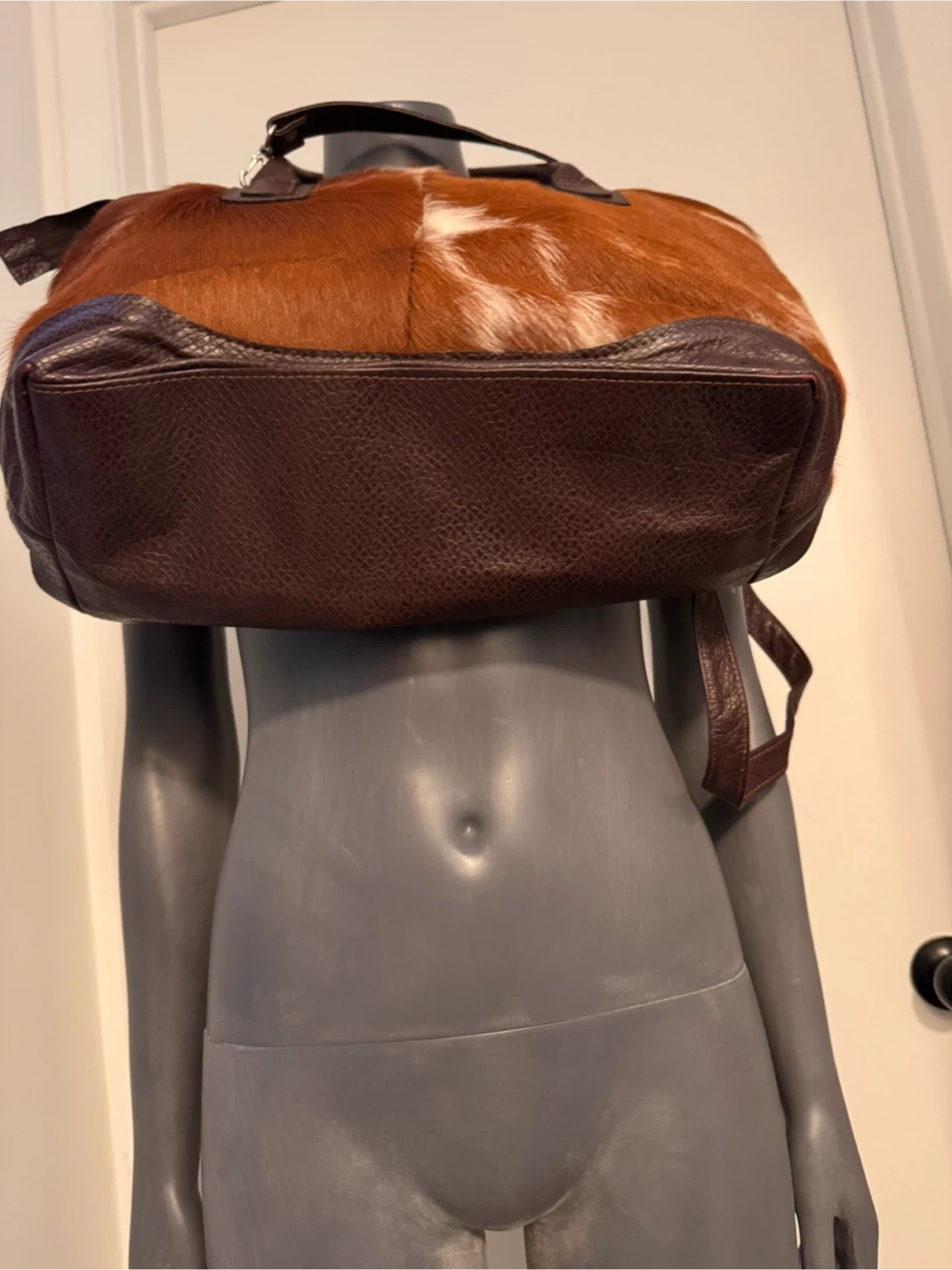 Here's a stylish tote bag featuring a unique combination of brown leather and cowhide! It has both handles and a shoulder strap for versatile carrying options. The bag is in great condition and ready for a new home