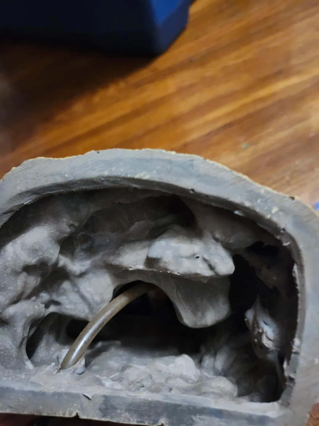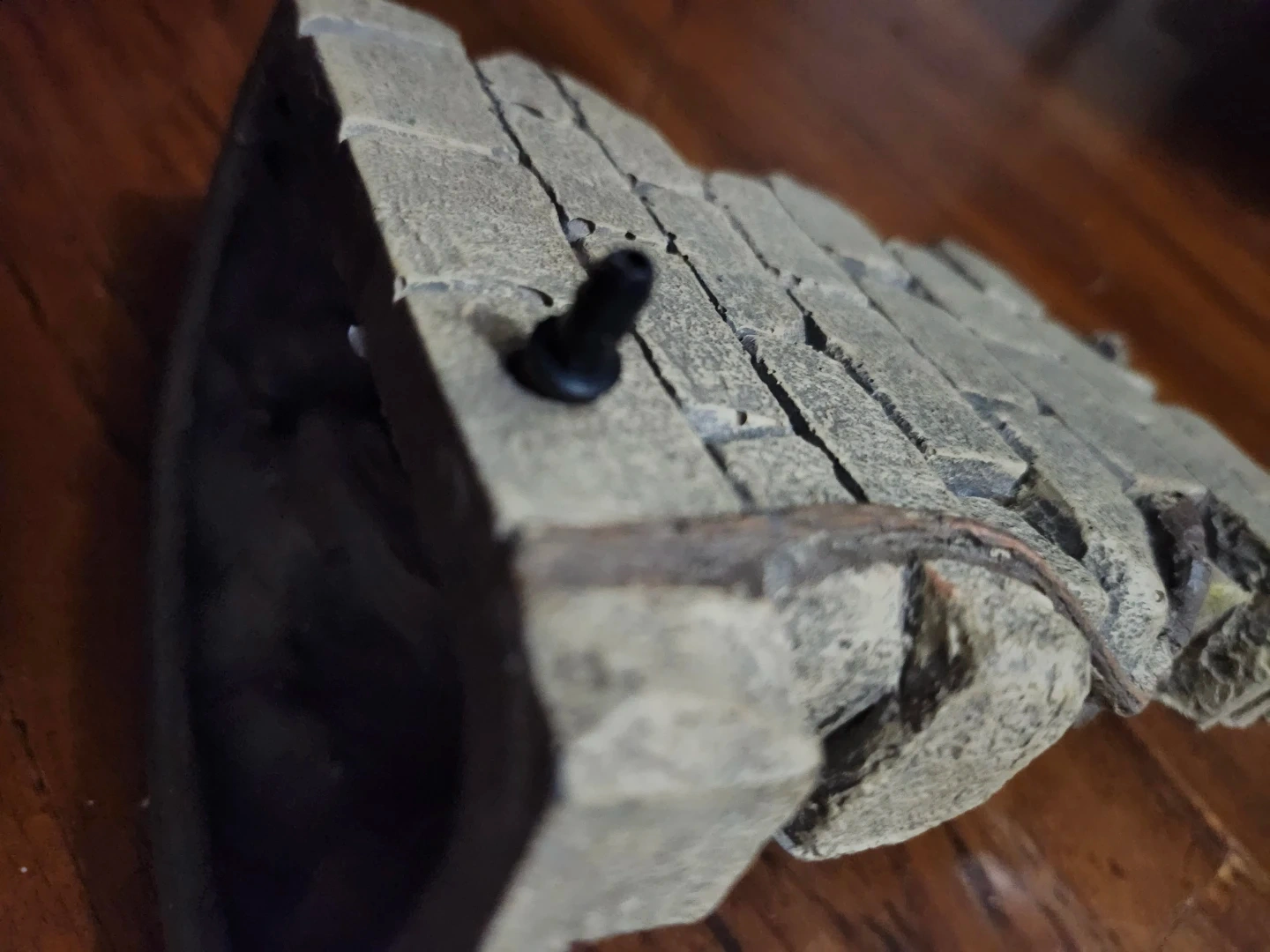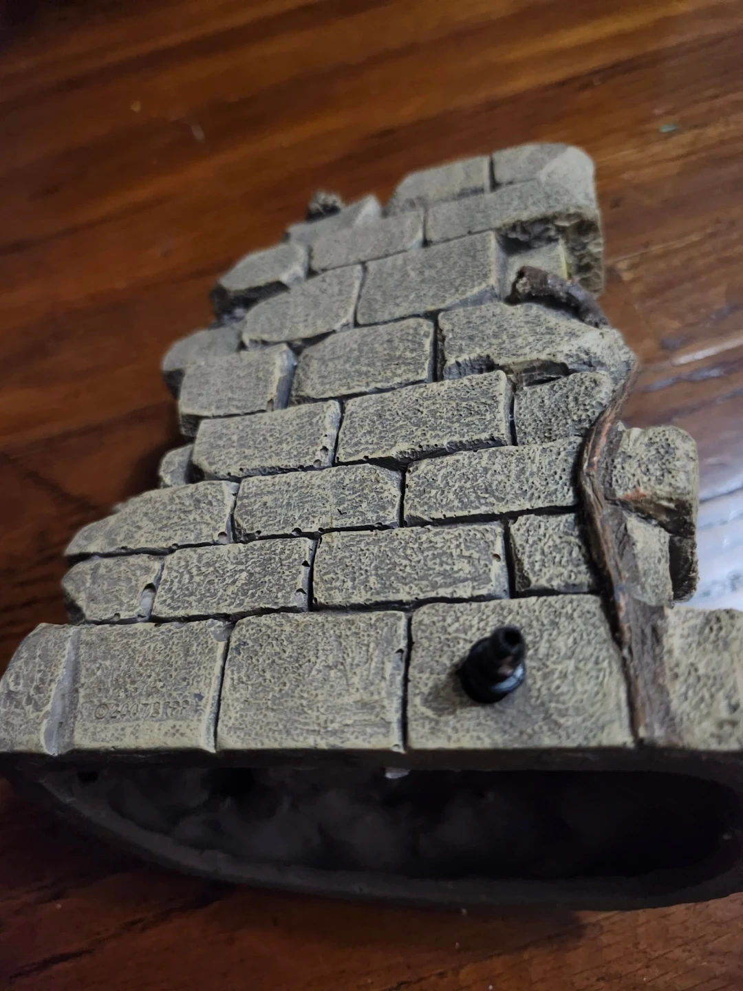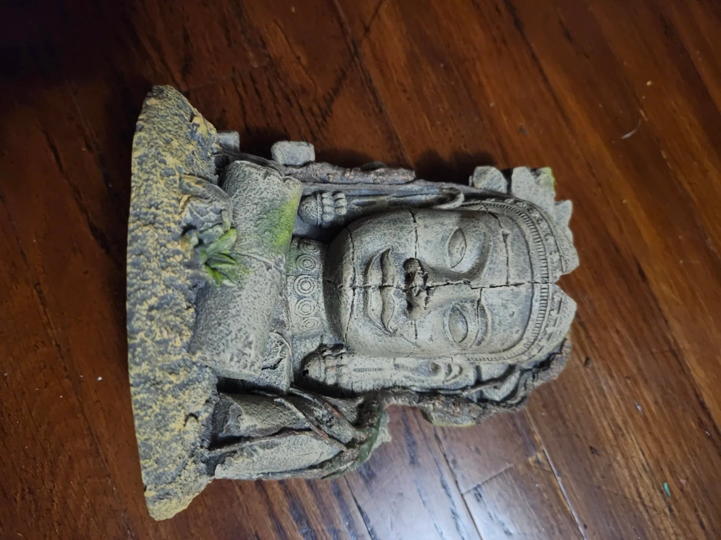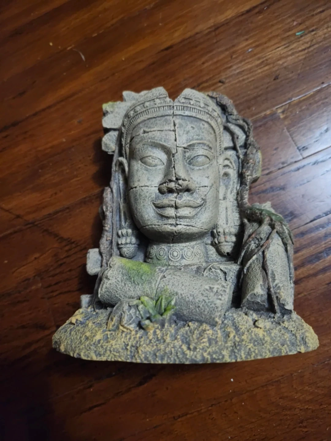 Selling an aquarium ornament. It has a stone wall design with a Buddha head on one side. It's in good condition and would be a nice addition to any fish tank