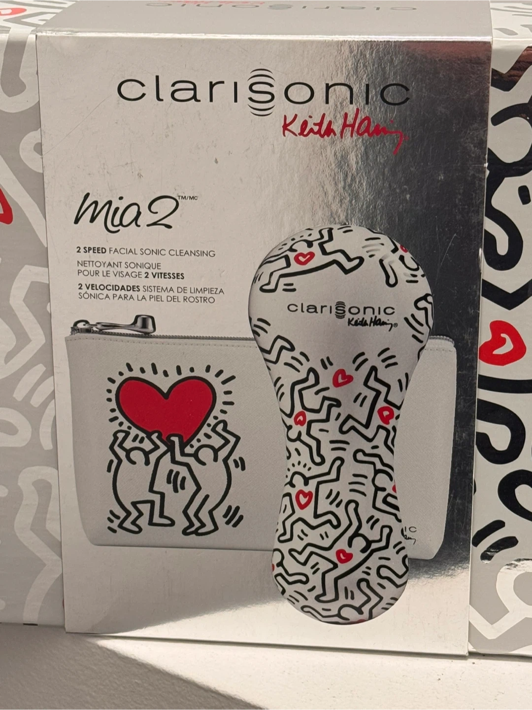 Selling a brand new Clarisonic Keith Haring Mia 2 "Love" Edition! This special edition comes in a beautiful gift box embossed with shiny silver artworks by Keith Haring. Included is a special Mia 2 device, a charger, a travel-sized (30ml) Clarisonic Refreshing Gel Cleanser, and a pretty faux-leather storage pouch. The Mia 2 device has a simple white plastic casing with a completely smooth finish. The back of the device is embossed with the "Love" artwork from Keith Haring, which is very fun and cute! The included pouch is also embossed with the "Love" artwork. The zipper-pull is shaped like a Clarisonic device. Brand new and never used. Only opened box to take pics. Paid 180+HST at Holts