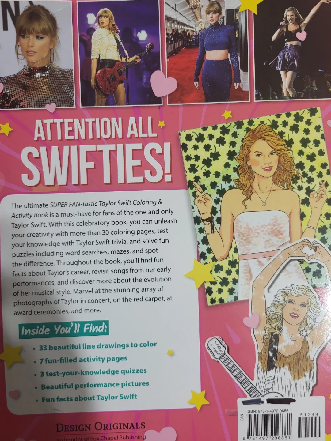 Selling a Taylor Swift Colouring & Activity Book. Inside you'll find 33 beautiful line drawings to colour, 7 fun-filled activity pages, 3 test-your-knowledge quizzes, beautiful performance pictures, and fun facts about Taylor Swift