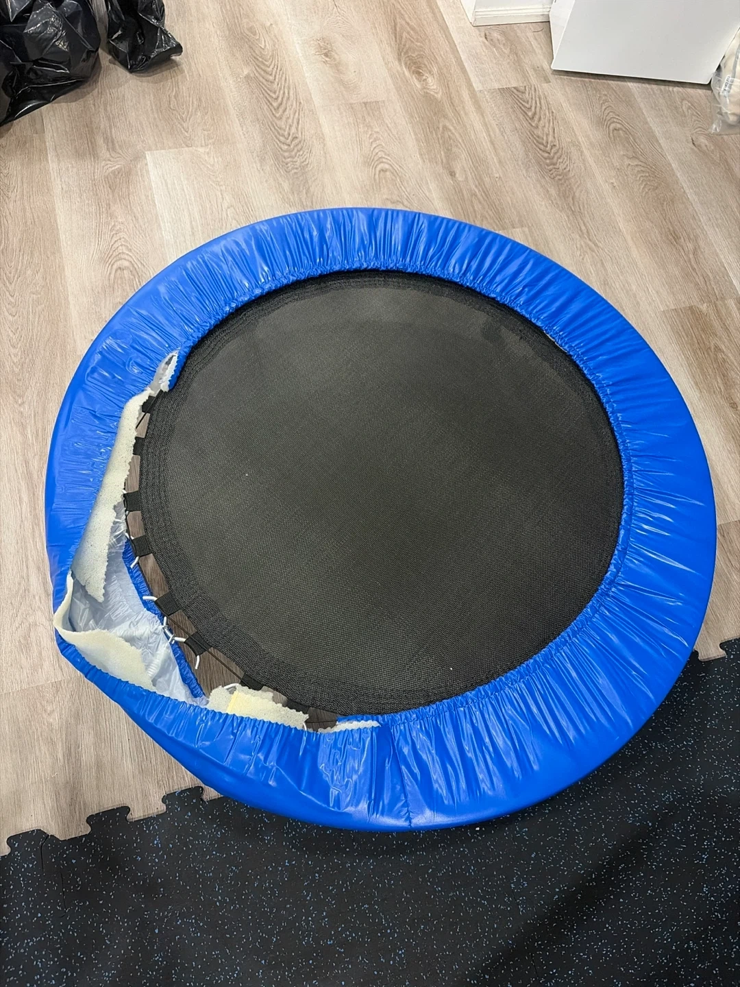 Selling a mini trampoline. It's blue with a black jumping surface. There's some wear and tear on the blue padding around the edge, as shown in the photos.