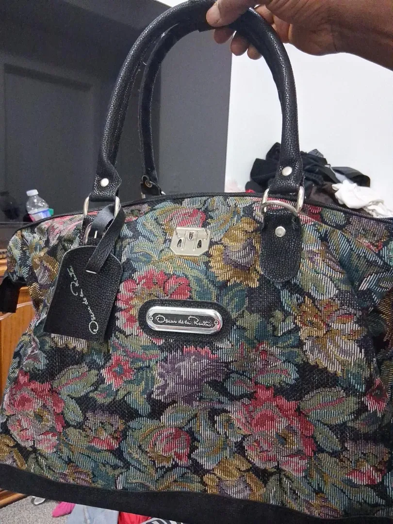 Selling a beautiful Oscar de la Renta handbag! It features a lovely floral tapestry design and black leather handles. Perfect for adding a touch of elegance to any outfit!