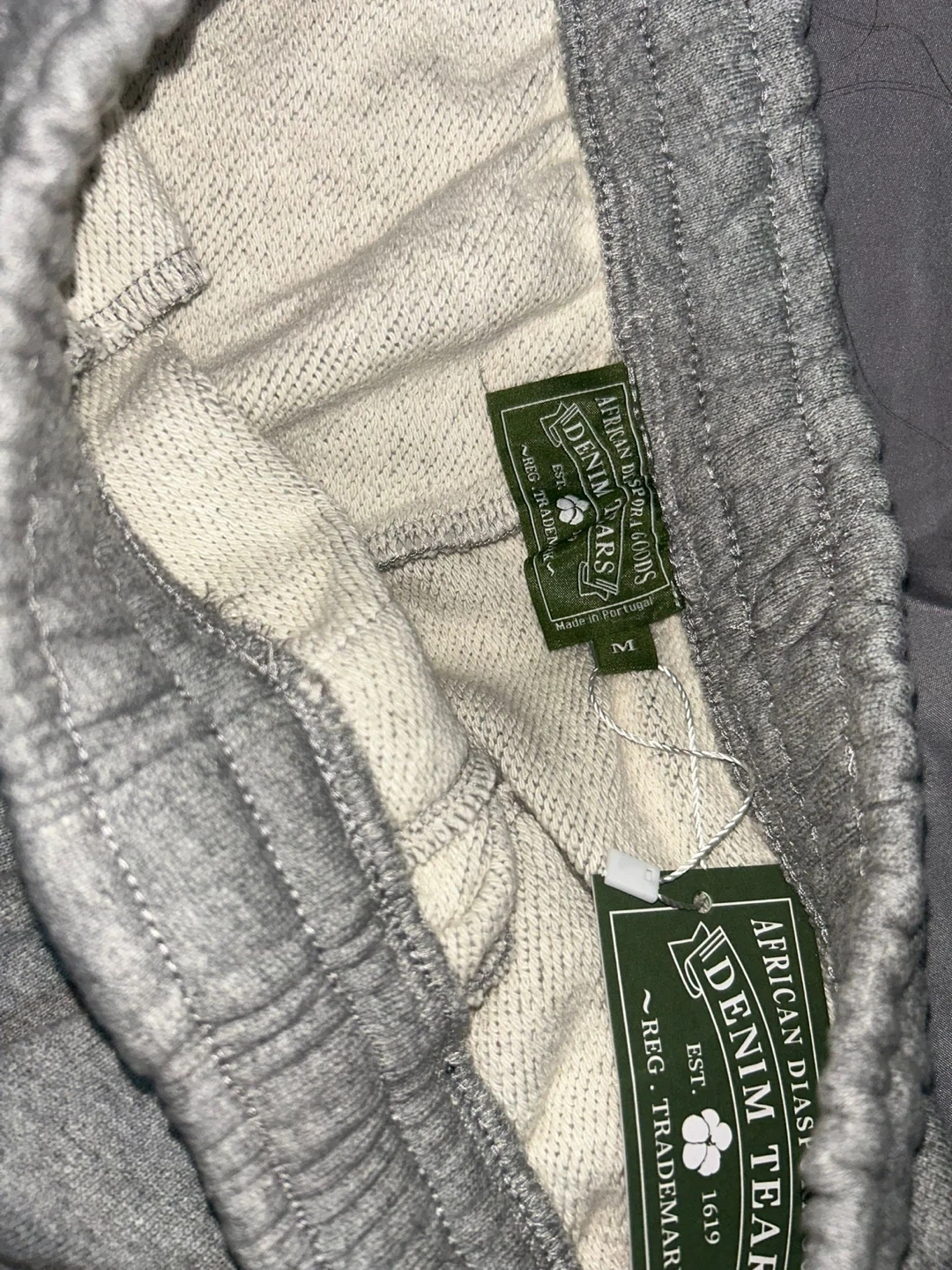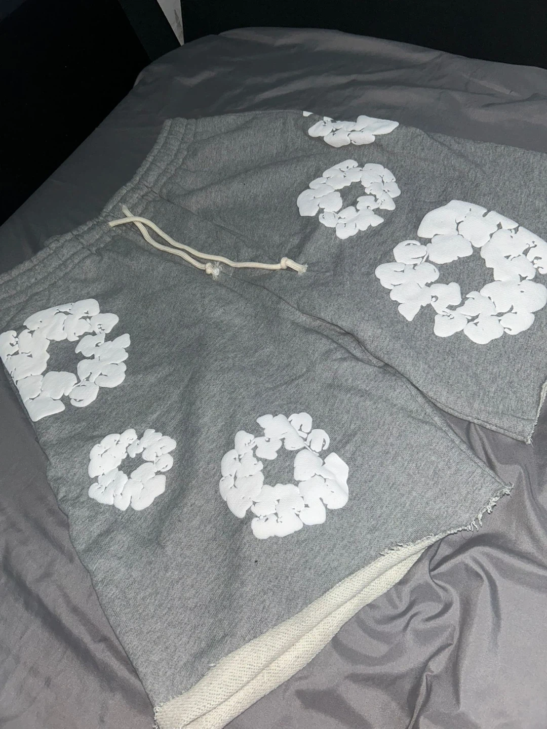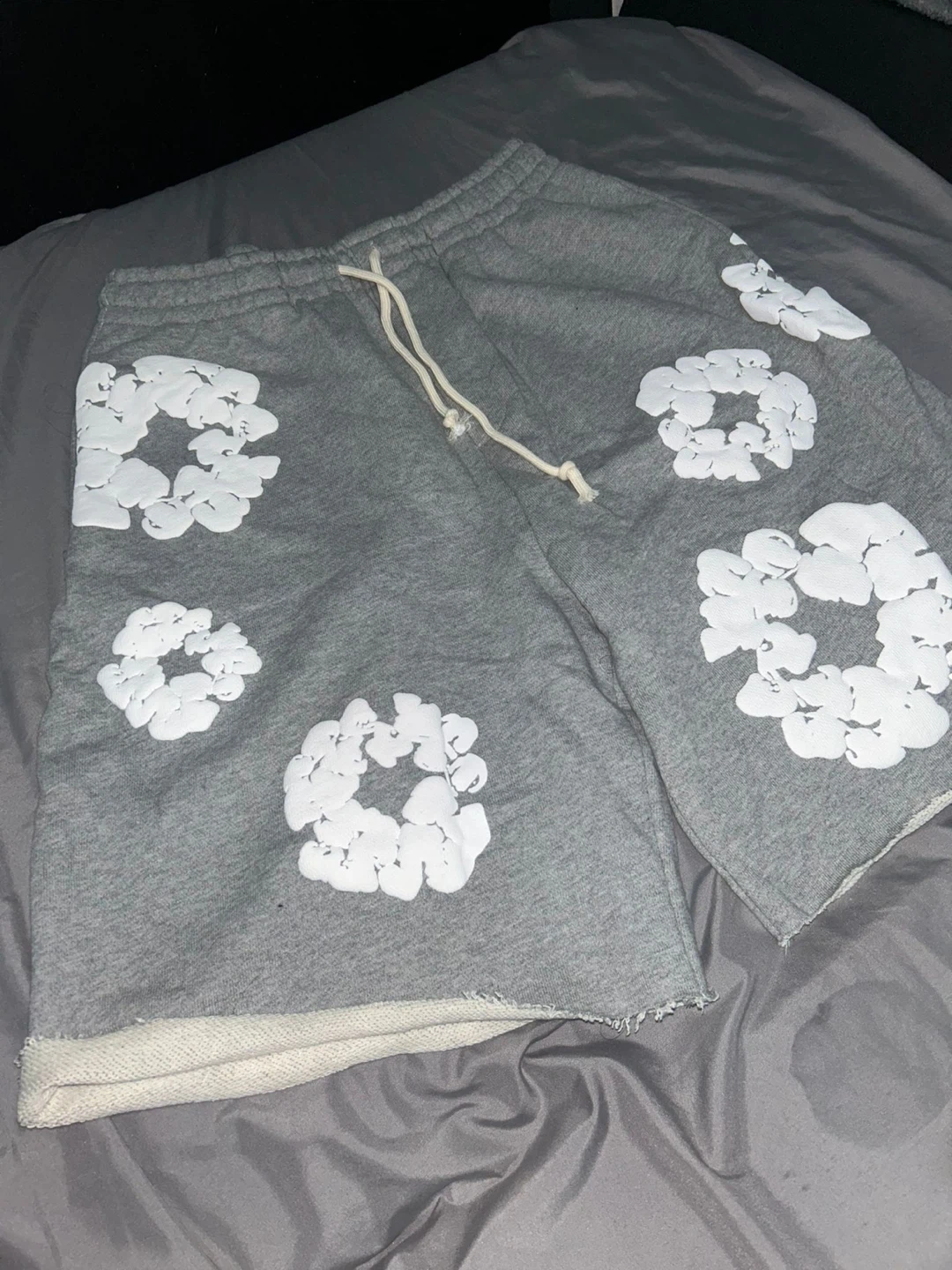 Selling a pair of Denim Tears sweat shorts in gray. They feature a unique floral design. The size is M and they are made in Portugal