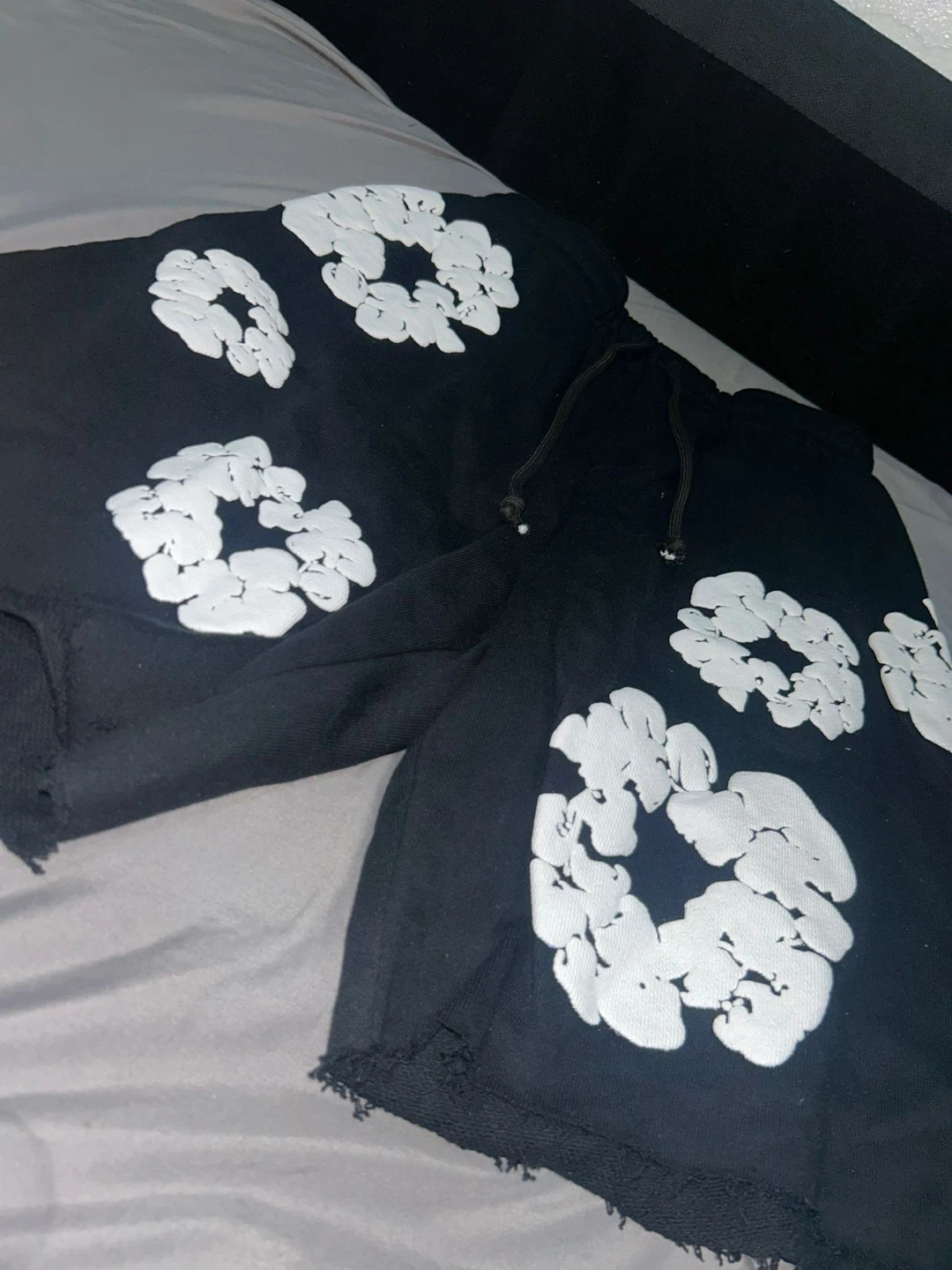 Selling a pair of black Denim Tears shorts in size medium. They feature a unique white floral design. Perfect for casual wear!
