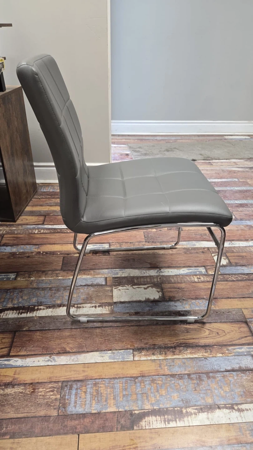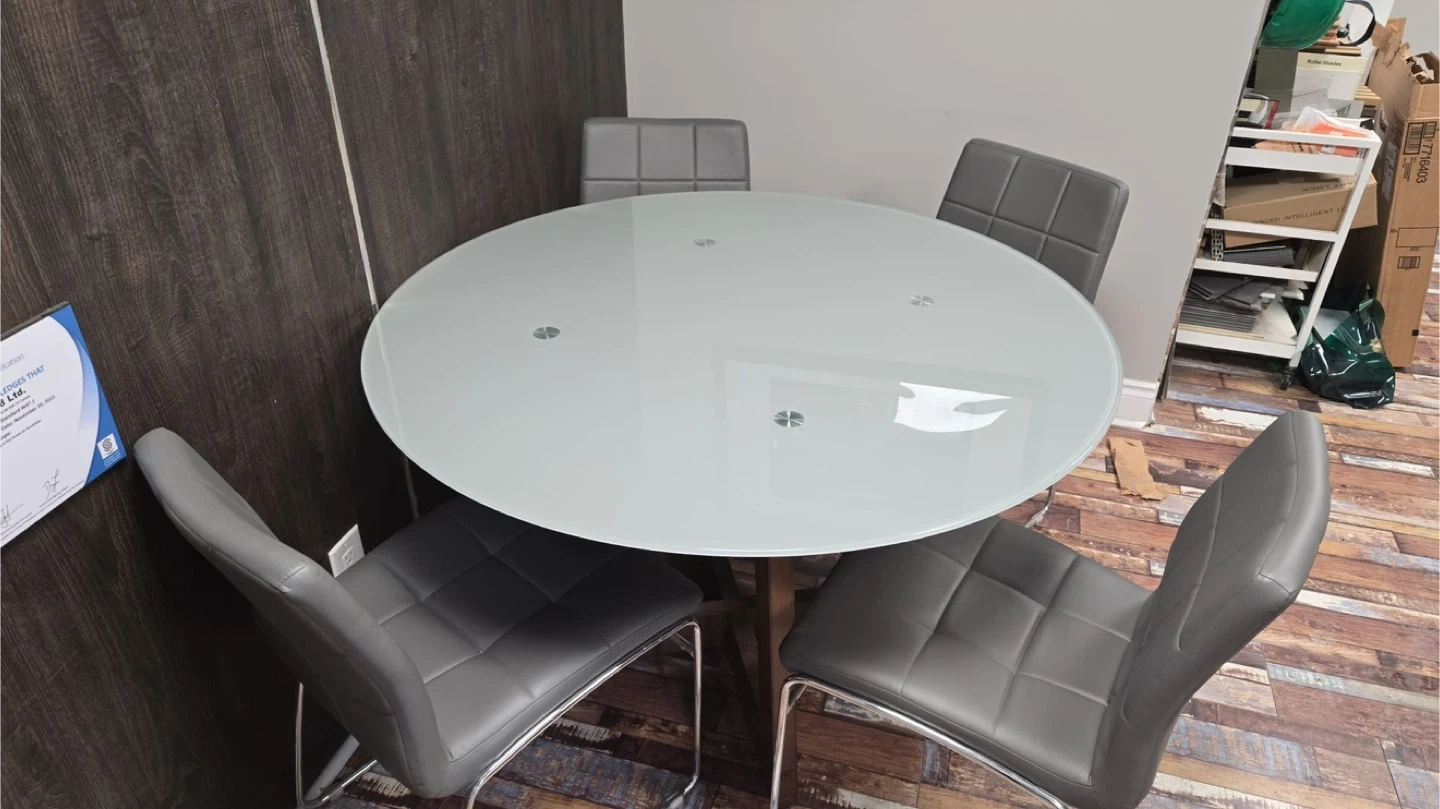 Selling a round glass dining table that comes with four stylish grey chairs. This set would look great in any dining room or kitchen space! The chairs have a modern design with a quilted pattern on the seats and backs. The table has a sturdy wooden base, and the glass top is easy to clean. It's perfect for small gatherings or family meals