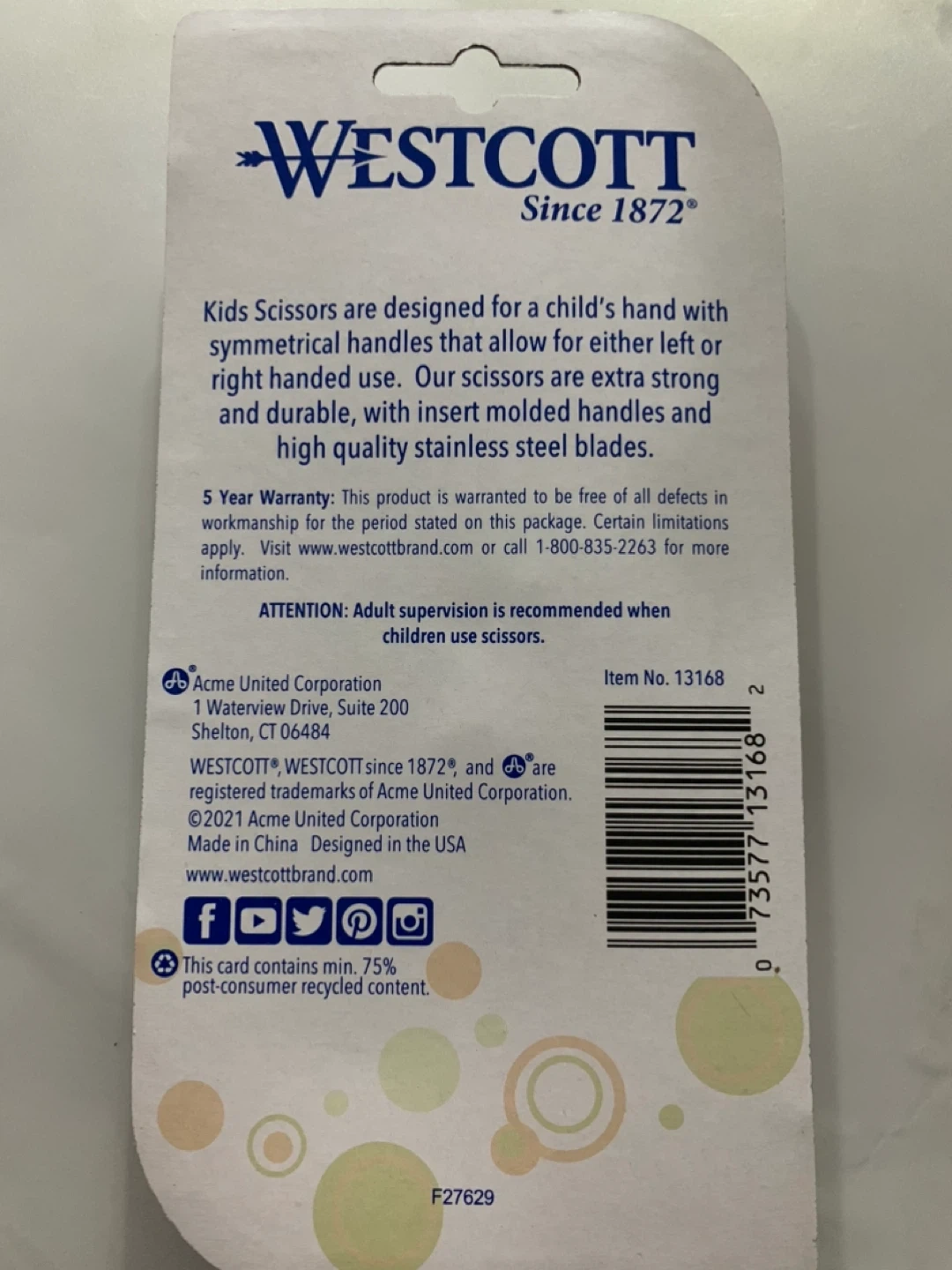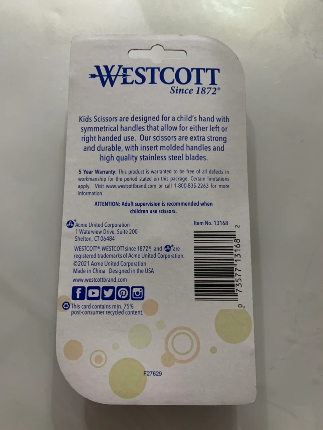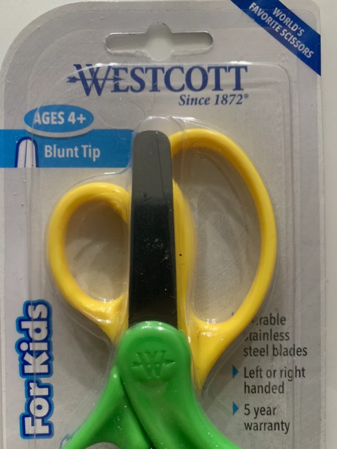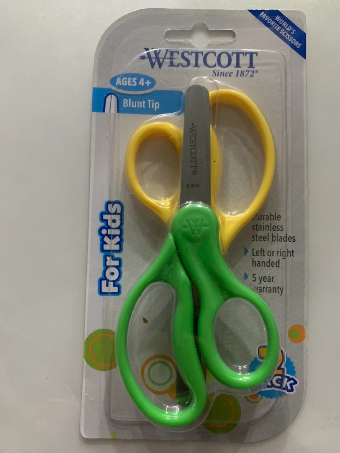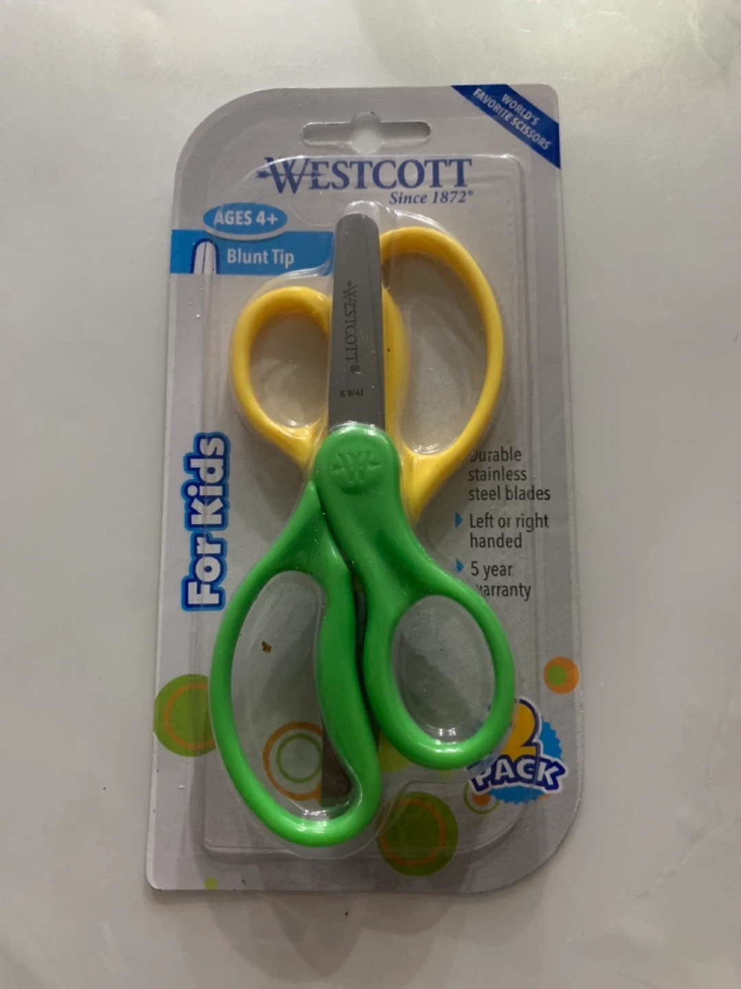Selling a brand new pack of Westcott kids scissors! These are designed for ages 4 and up and feature a blunt tip for safety. They're perfect for little hands and can be used by both lefties and righties. Durable stainless steel blades with a 5-year warranty included