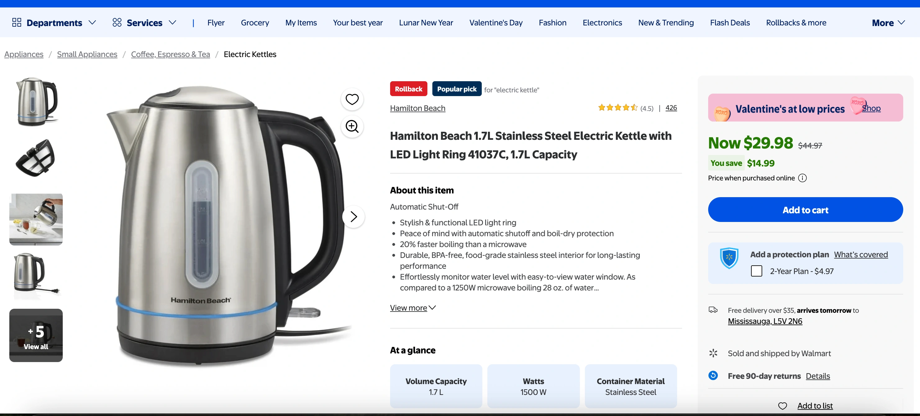 Listing on Walmart website: https://www.walmart.ca/en/ip/Hamilton-Beach-1-7L-Stainless-Steel-Electric-Kettle-with-LED-Light-Ring-41037C/6000205907811