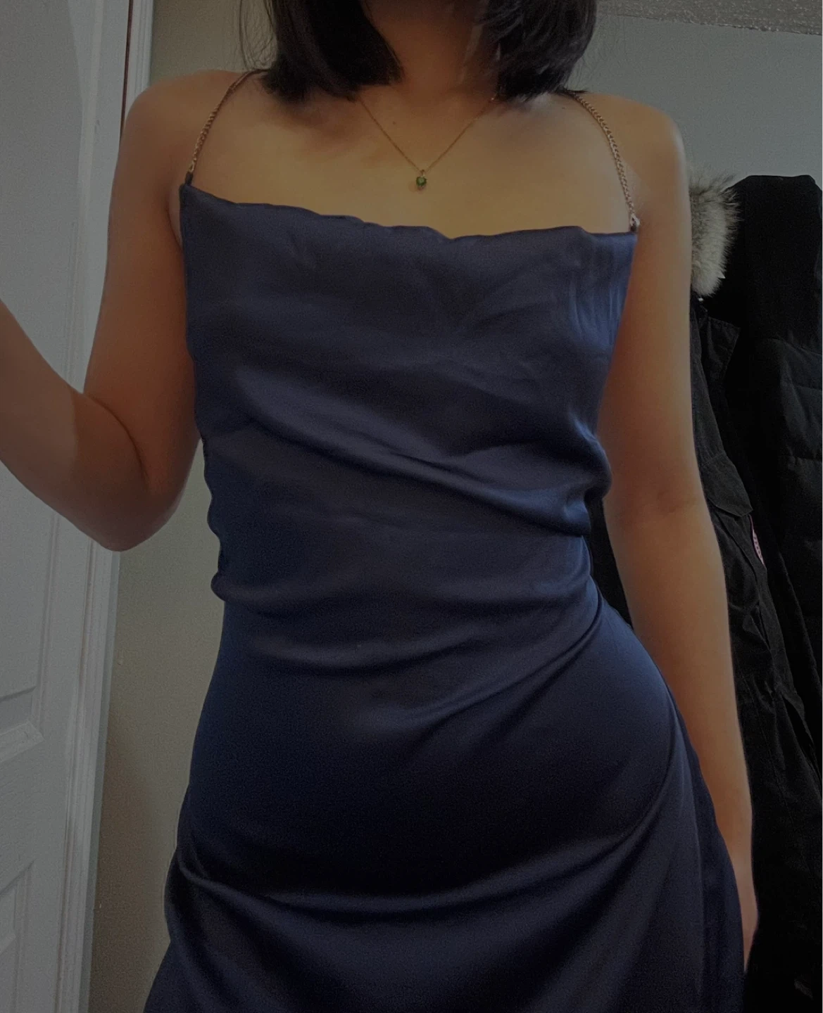Selling a ROMWE navy blue dress in size small. It features a stylish design with chain straps. Perfect for a night out or a special occasion!