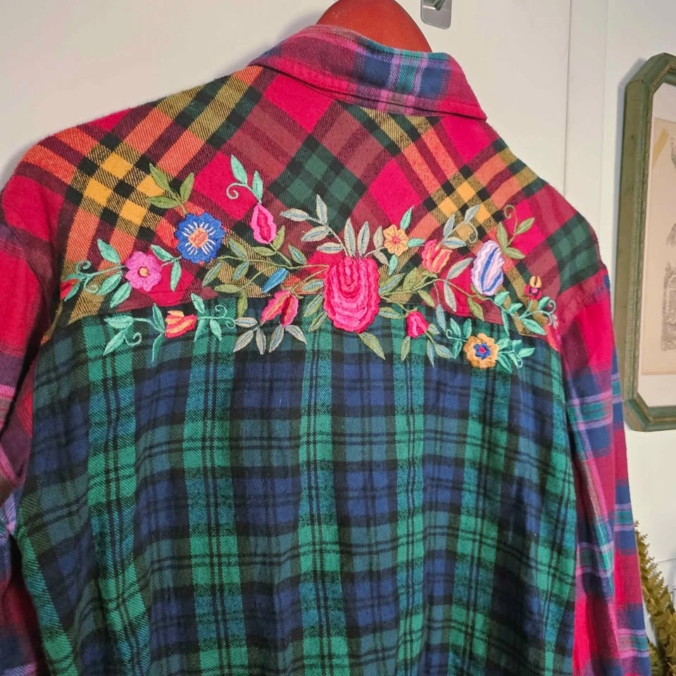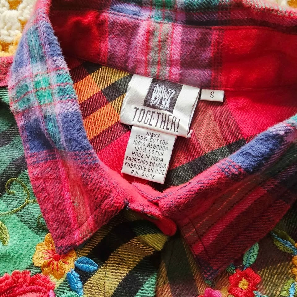 Keywords: patchwork plaid, grunge, cabincore, Y2K retro, artsy, boyfriend plaid, vintage plaid shirt, embroidered flannel, y2k top, cottagecore shirt, boho folk top, art teacher style, cozy vintage, floral embroidery, grunge fairy, 90s shirt, oversized button up.