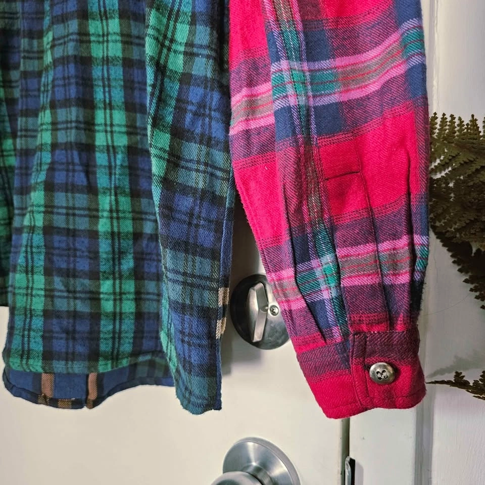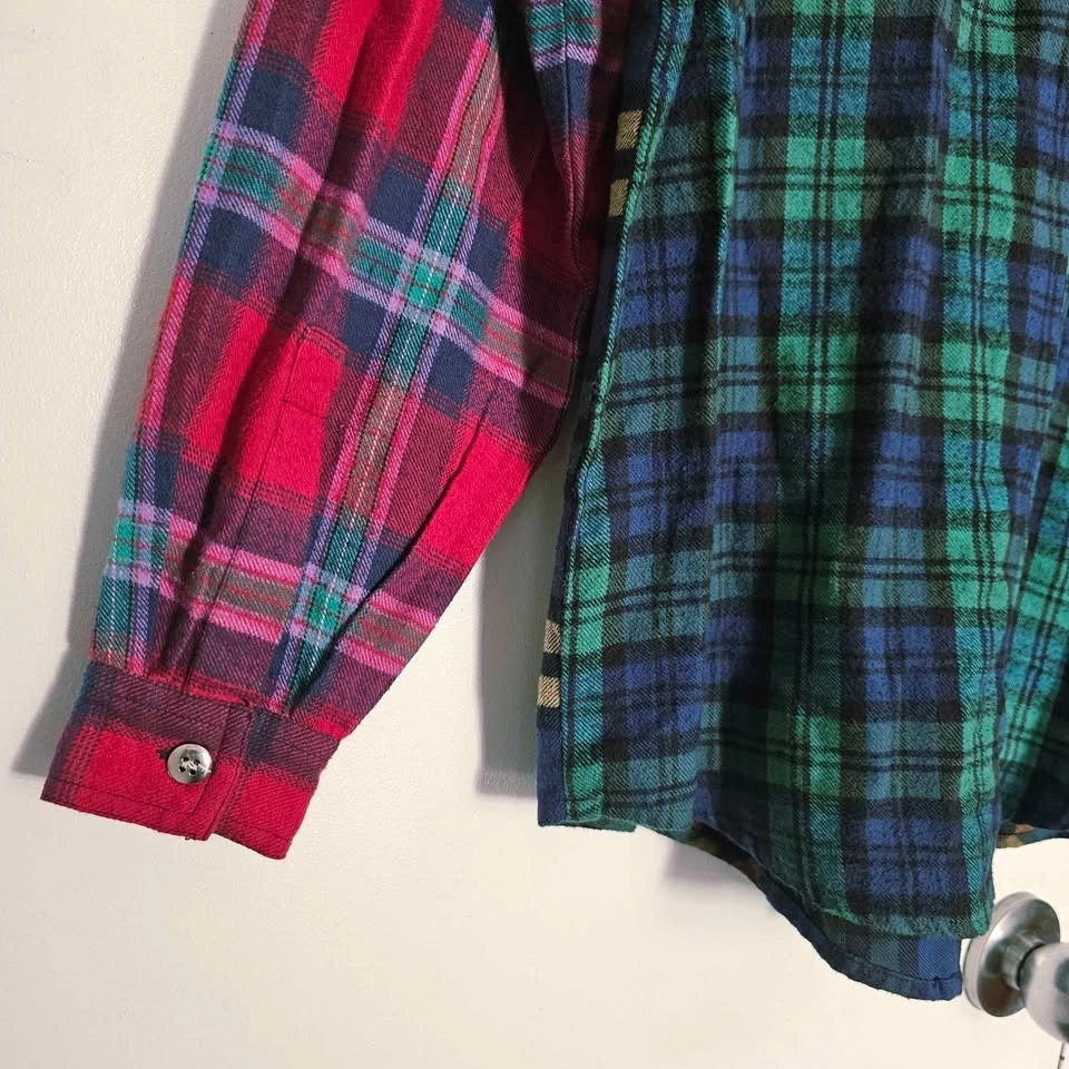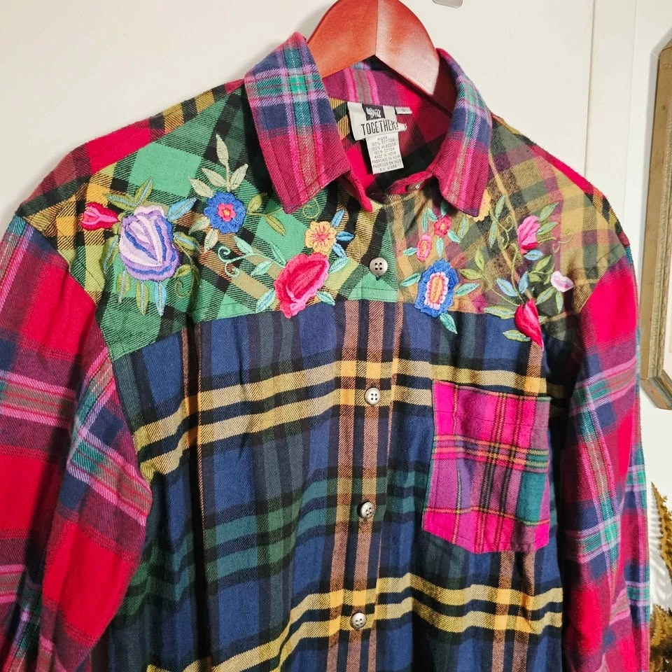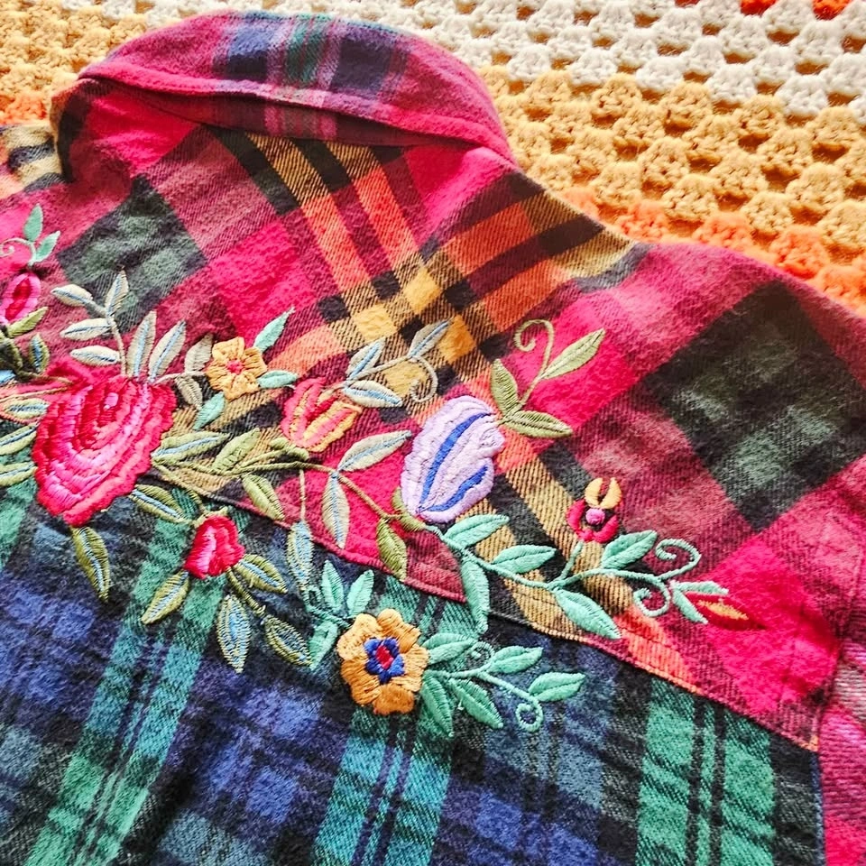 Keywords: patchwork plaid, grunge, cabincore, Y2K retro, artsy, boyfriend plaid, vintage plaid shirt, embroidered flannel, y2k top, cottagecore shirt, boho folk top, art teacher style, cozy vintage, floral embroidery, grunge fairy, 90s shirt, oversized button up.