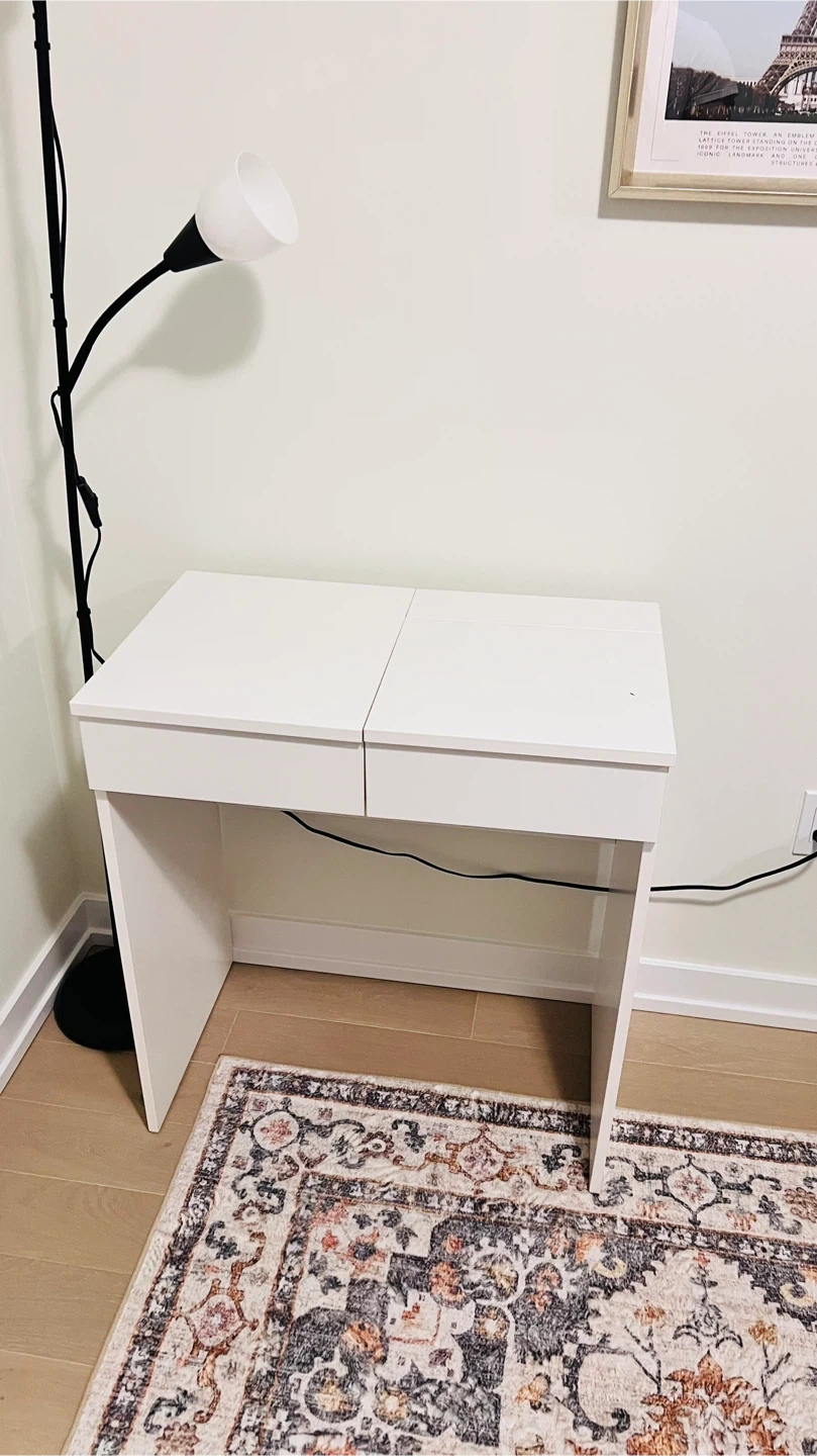 Selling a lovely white IKEA dressing table with a built-in mirror. The inside of the drawer is red. The dimensions are approximately 70 cm (27 1/2") wide, 42 cm (16 1/2") deep, and 109 cm (42 7/8") high.