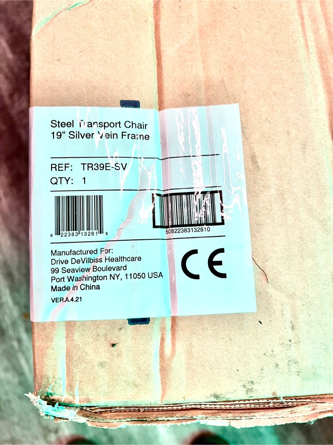 Brand new, factory-sealed Drive Medical steel transport wheelchair. Never opened or used.