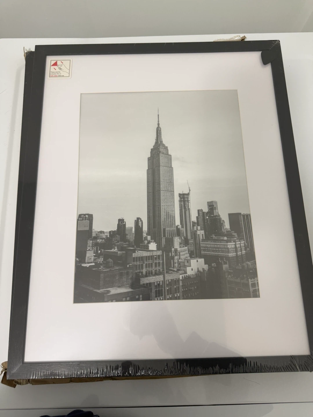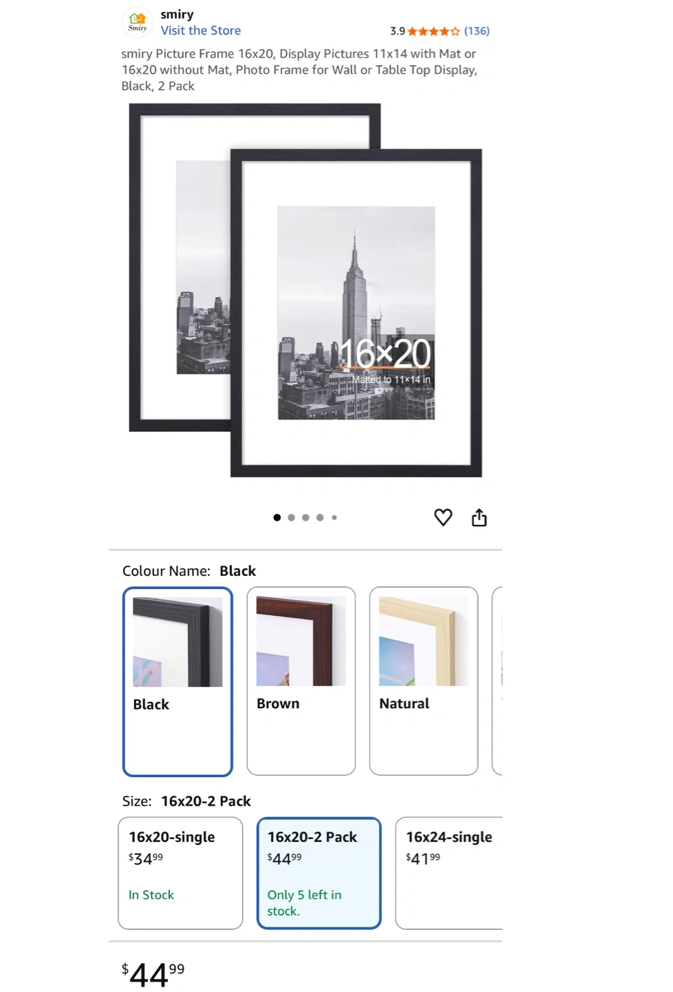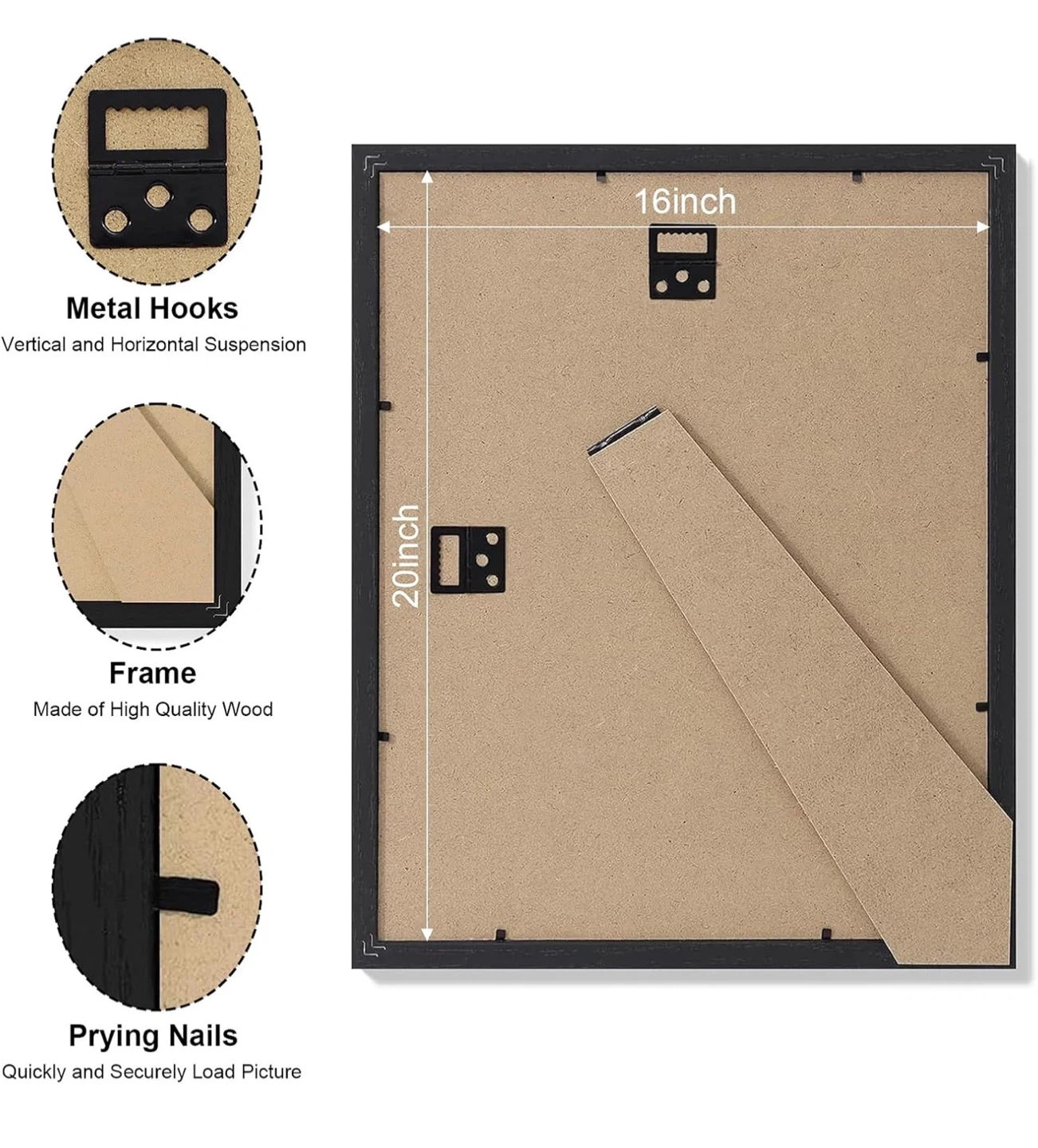 Selling a black Smiry picture frame, sized 16x20 inches. It's made of high-quality wood and includes metal hooks for vertical or horizontal suspension. It can display pictures 11x14 with a mat or 16x20 without a mat. Great for wall or tabletop display!
