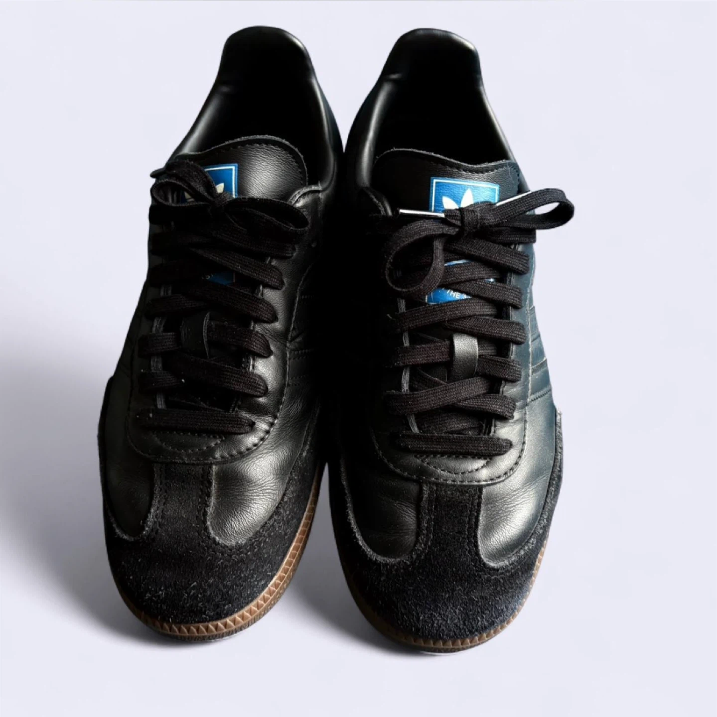 Selling a pair of Adidas Samba shoes in black! These classic sneakers are in great condition and ready for a new home. Perfect for everyday wear or a casual sporty look. They have a leather upper and a gum rubber sole.