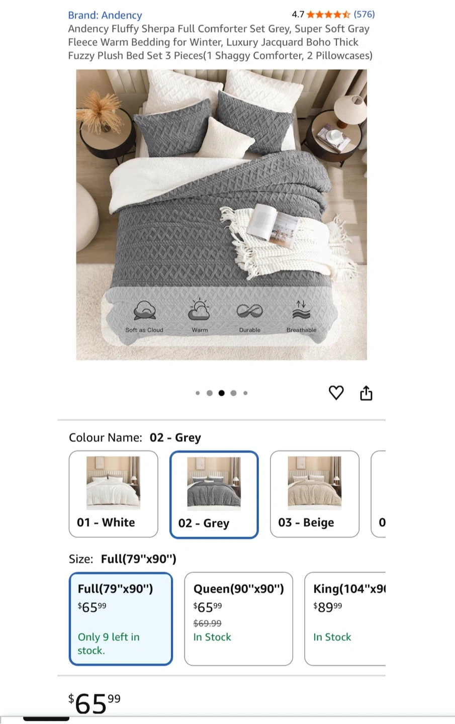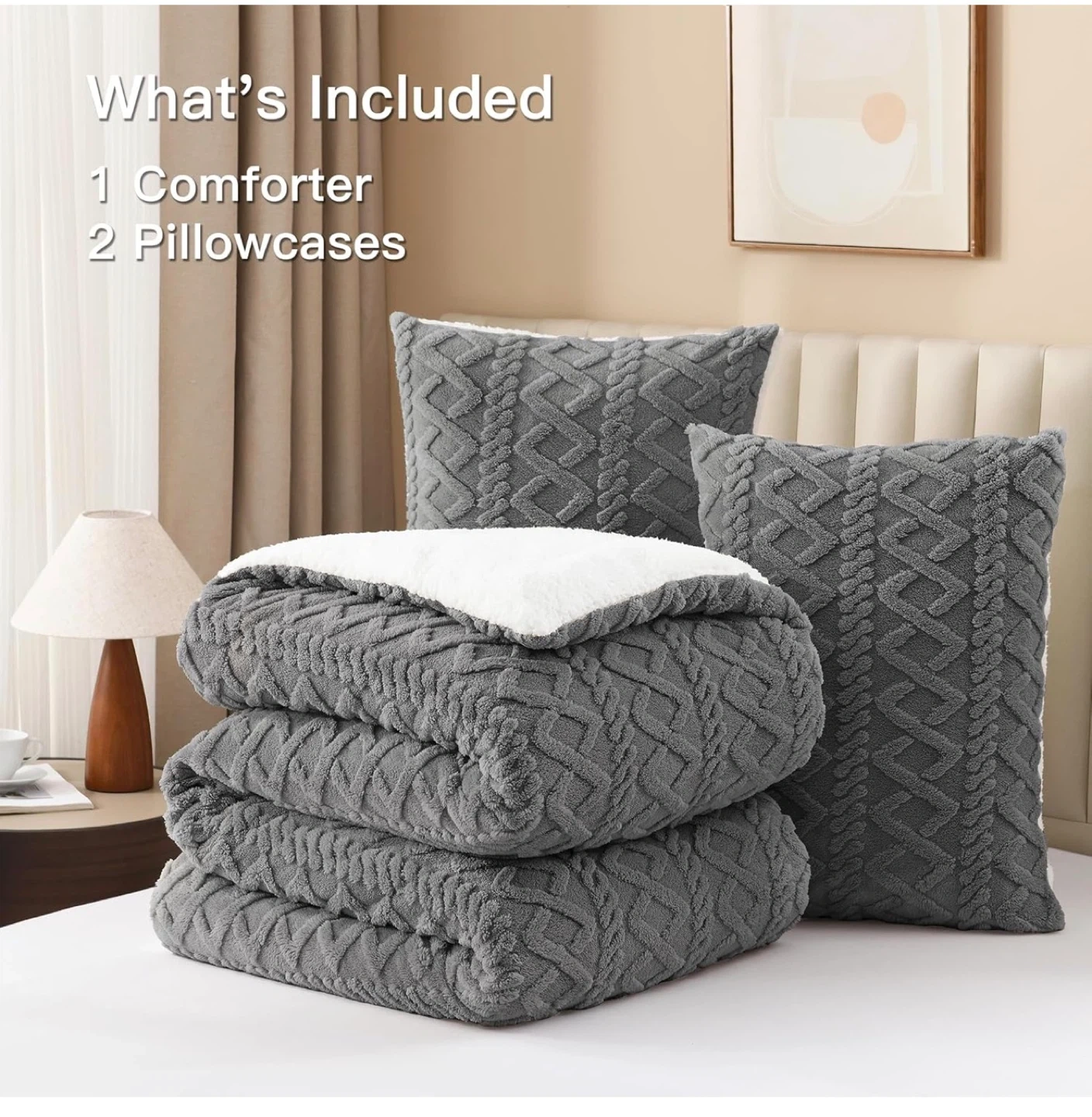 Snuggle up with this super comfy comforter set! It's an Andency brand set in a lovely grey colour. The material is a soft sherpa velvet, perfect for adding warmth and a touch of boho style to your bedroom. It includes one comforter and two pillowcases. It's soft as a cloud, warm, durable and breathable!