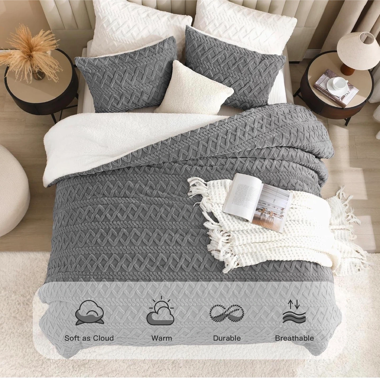 Andency Grey Boho Tufted Sherpa Velvet Comforter Set. Full size