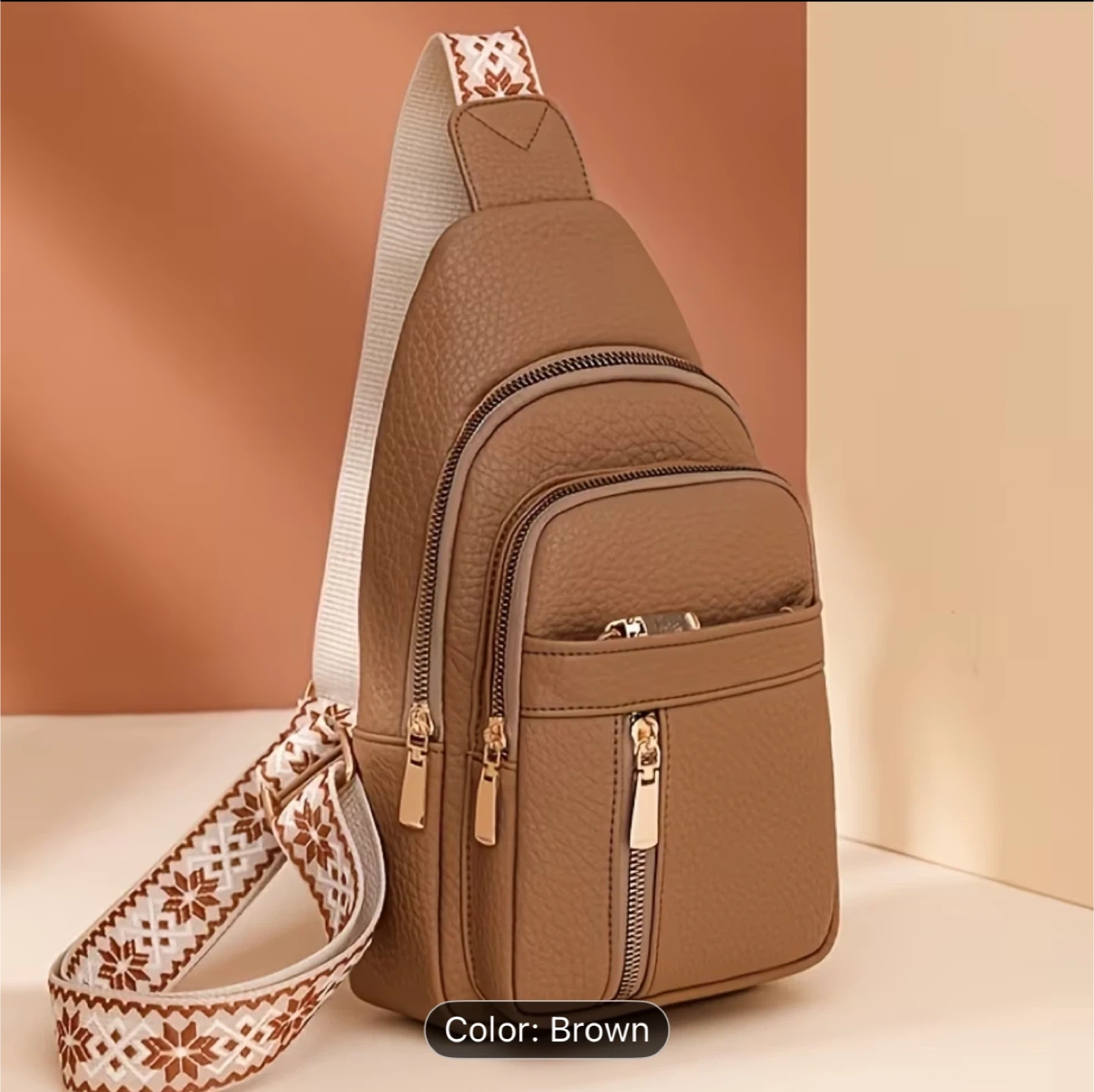 Vantage brown sling bag, perfect for everyday use! It features multiple zippered compartments to keep your belongings organized. The strap has a unique pattern that adds a touch of flair