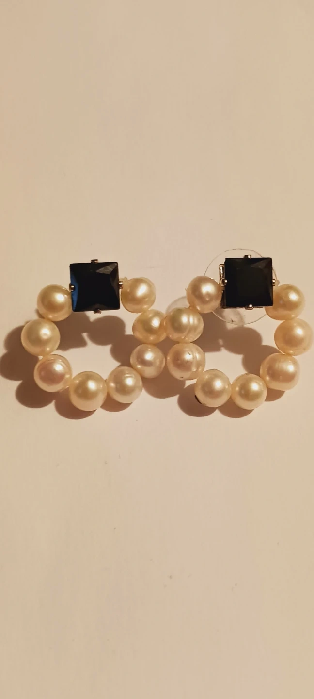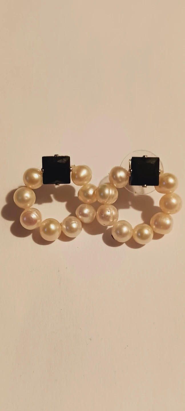Beautiful elegant genuine Freshwater pearl earrings with a black stone accent. They are in great condition and would make a lovely addition to any outfit !! 1" diameter. Excellent condition. ALL MY PRICES ARE NEGOTIABLE !!